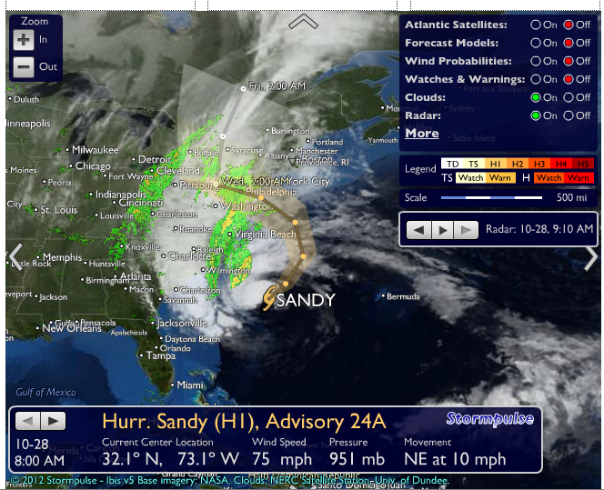 Southern New England should begin to feel the outer fringe affects from Sandy by later today in the form of scattered light showers and a freshening northeasterly breeze. But the real action should begin later tonight and build during the day tomorrow. So you still have a good deal of time to prepare if you haven’t already done so.