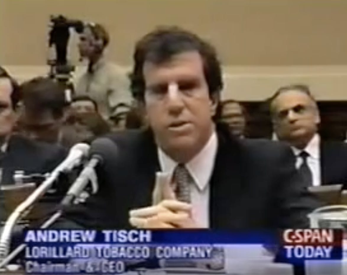 However, Tisch may be best known for his dramatic testimony before Congress when he was the CEO of Lorillard Tobacco Company, when he and other leading tobacco execs shocked members of Congress and the American public in claiming that there was no link between tobacco and cancer and that nicotine was not addictive.