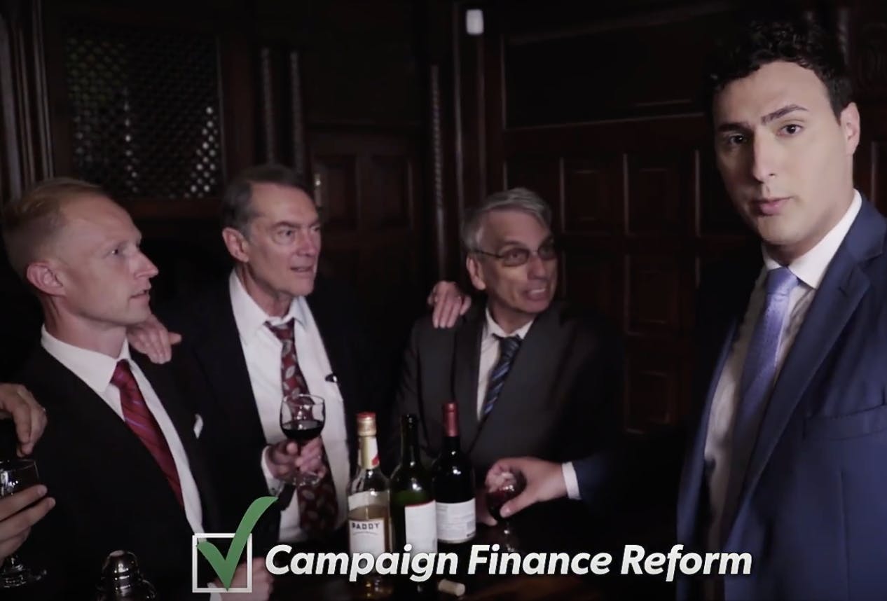 Progressive candidate for Lt. Governor Aaron Regunberg’s television ad about insider dealing and the need to reform lobbying in Rhode Island featured volunteer Andrew Cagen playing the role of a “corrupt insider.”