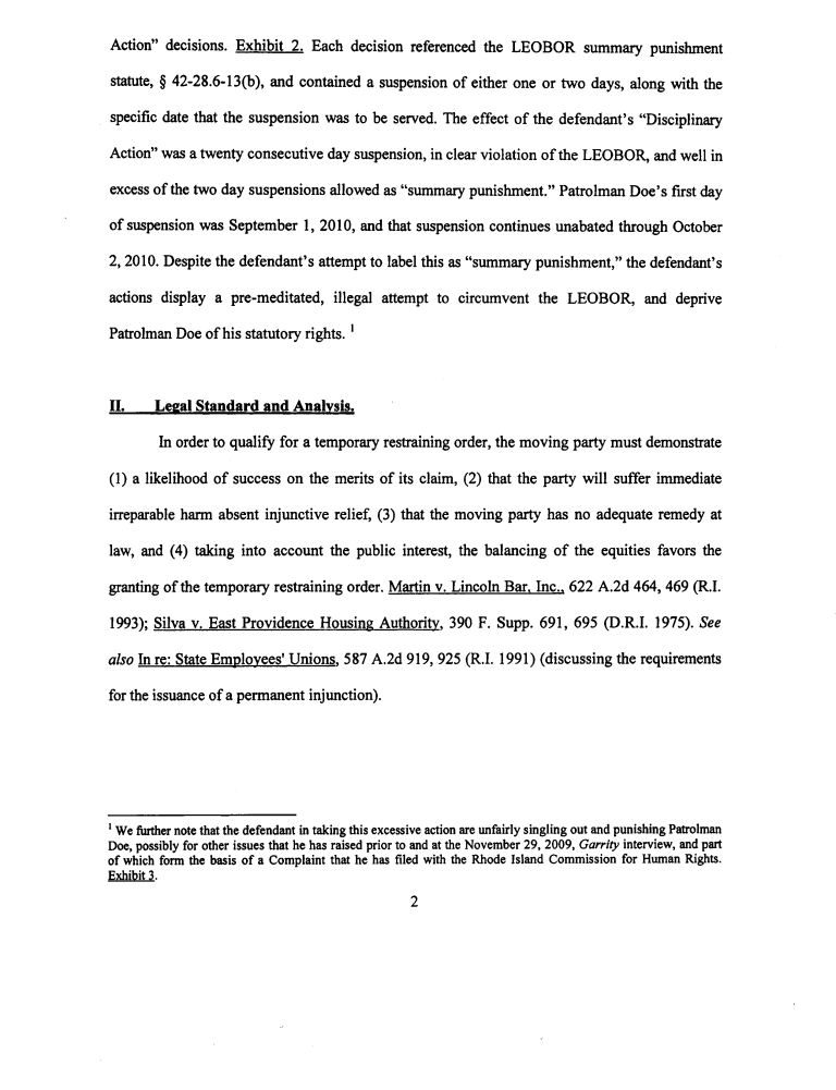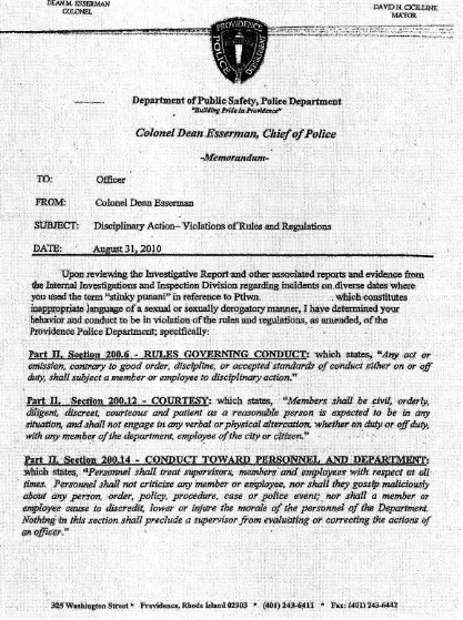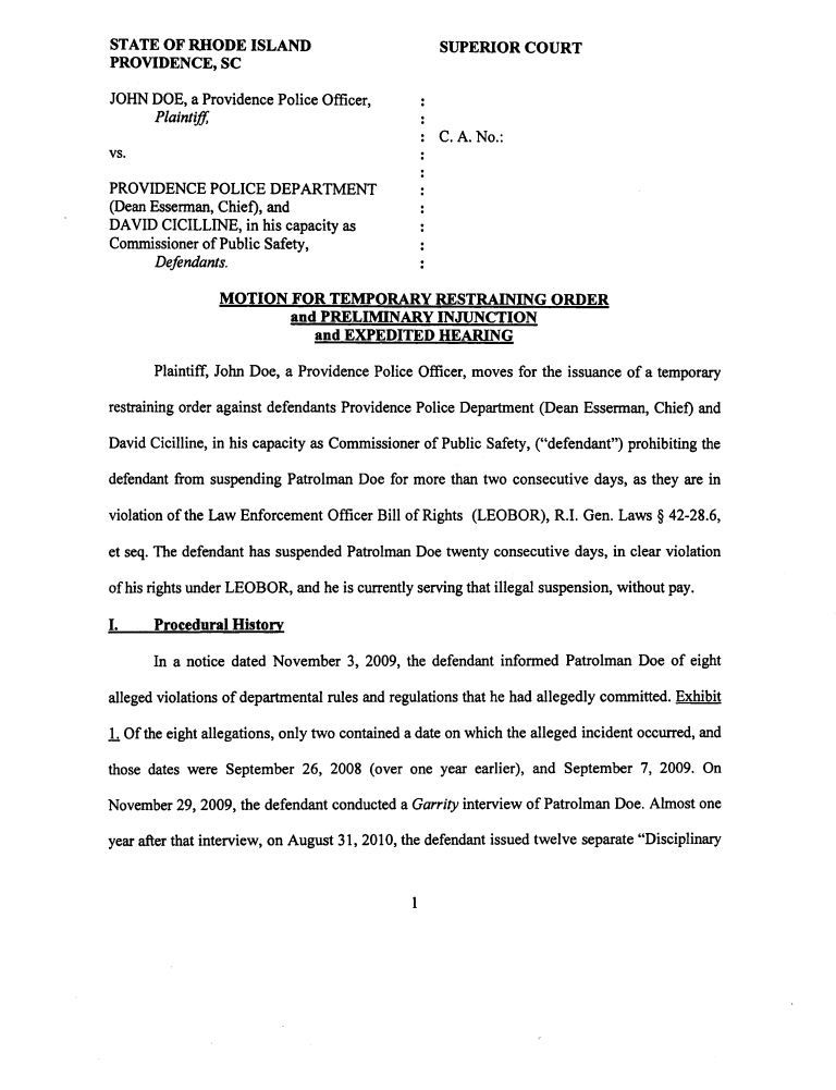 Below are excerpts from a restraining order that Officer Gregory Daniels filed on Friday against the Providence Police Department. Daniels is accusing the department of illegally suspending him for more than two days and seeks to be reinstated. The second document is an example of one of the dozen charges for which Daniels was suspended. His name is redacted from these documents, but GoLocalProv has learned his identity from a letter his attorney sent to the Police Department regarding a sexual harassment claim. Click here for more information and a copy of the letter. Click here to read about the suspension case.