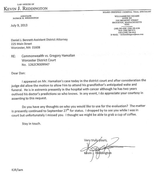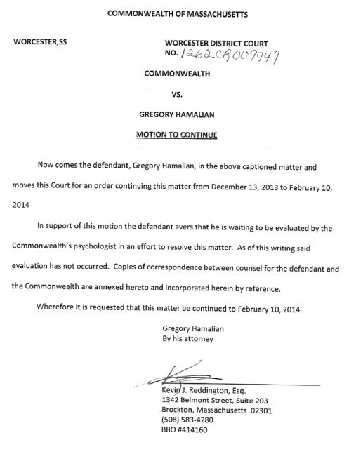 The court allowed for Hamalian to attend his grandfather's wake during this court date. The case was continued so that Hamalian could be evaluated by a psychiatrist.