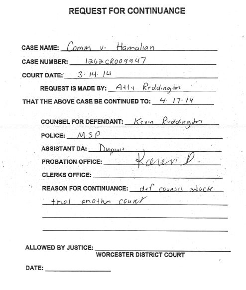 The exact reasoning for the continuance couldn't be found within Hamalian's court file.