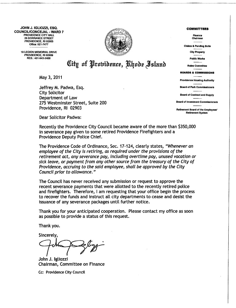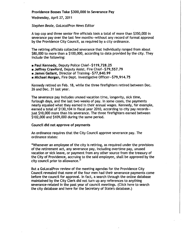His letter, in which he said he only recently became aware of the payments, included a copy of the original GoLocalProv report on severance. (See below.)
