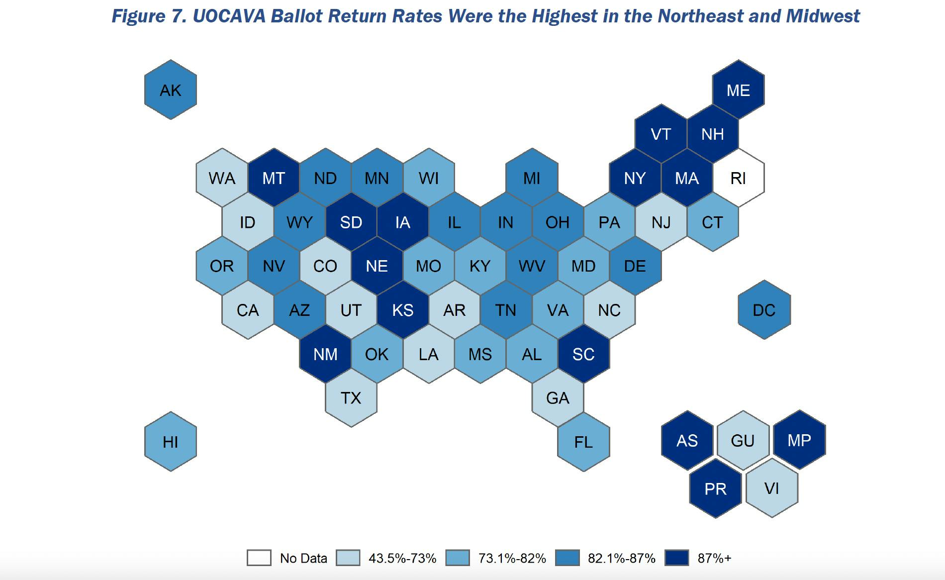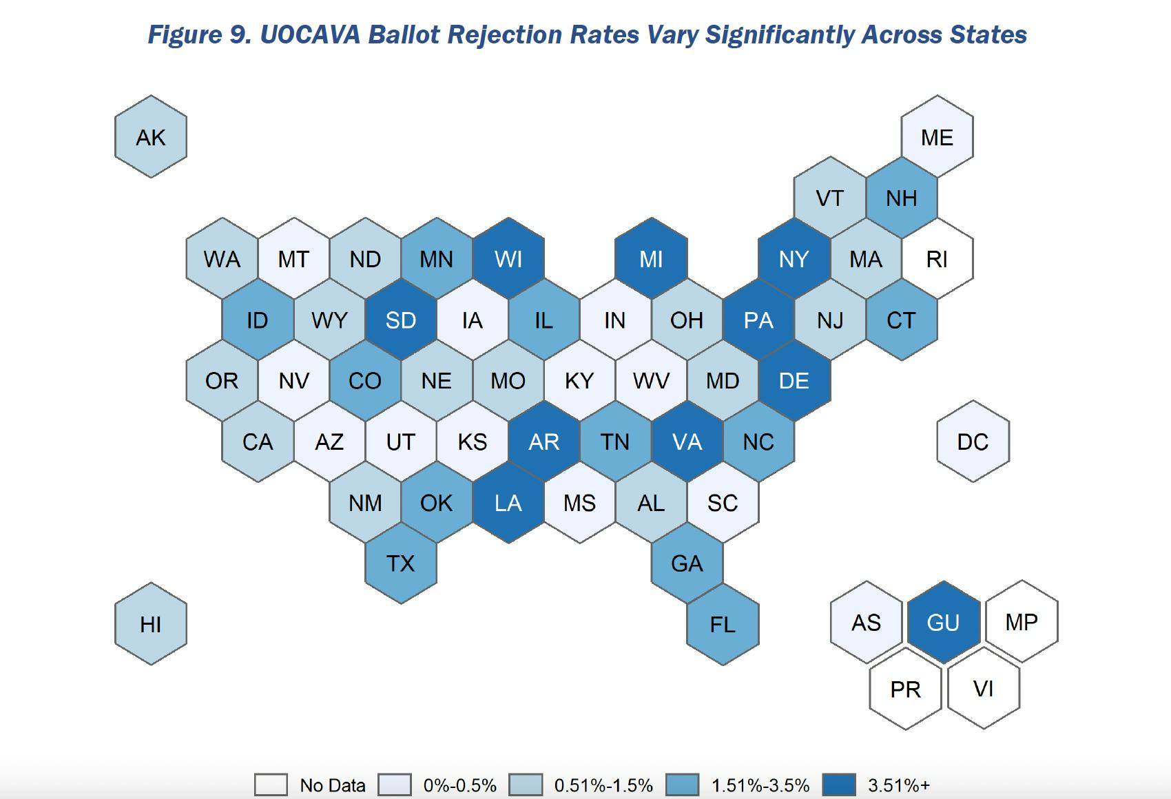 According to the 252-page report, Rhode Island failed to report UOCAVA Ballot Return Rates and did not return the state's Ballot Rejection Rate. Rhode Island was the only state that failed to provide the data.