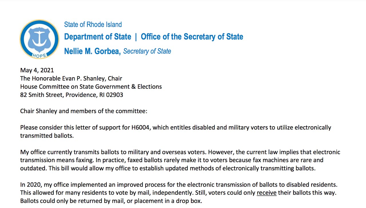 In a letter to Representative Evan Shanley, chair of House Committee on State Government & Elections from Gorbea about legislation relating to disabled Rhode Islanders, she wrote, "My office currently transmits ballots to military and overseas voters. However, the current law implies that electronic transmission means faxing. In practice, faxed ballots rarely make it to voters because fax machines are rare and outdated. This bill would allow my office to establish updated methods of electronically transmitting ballots."