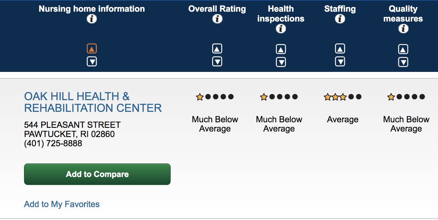 When asked about the number of violations, the company said in a follow-up email on Thursday night to GoLocal, “Regarding the Oak Hill past, Centers Health Care have had 2 very good surveys and graduated the facility out of special survey. The main point is we bought it after they had their serious issues about three years ago. The last year, Oak Hill had very few deficiencies and a perfect survey.”