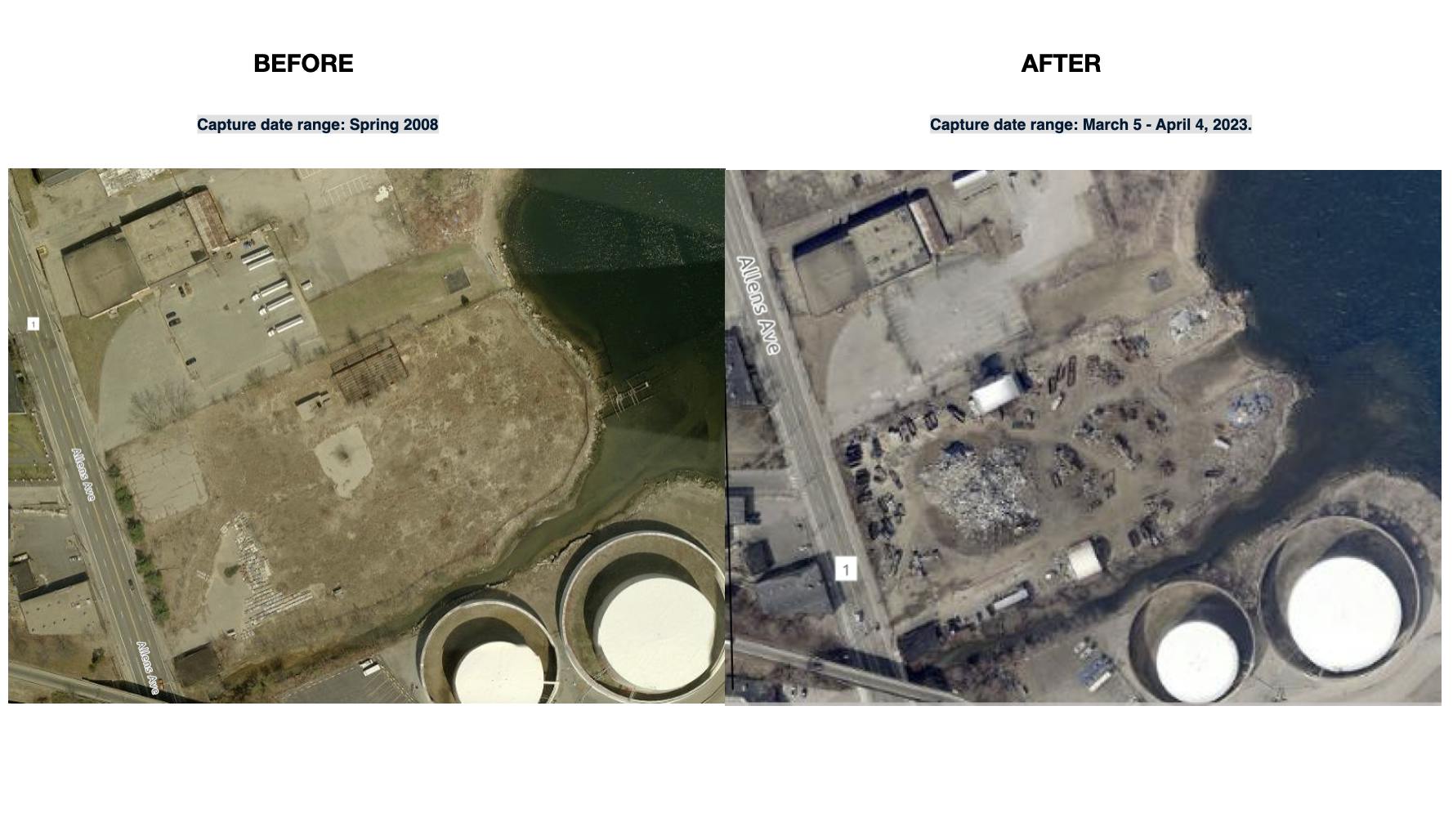 Aerial photos generated by the Rhode Island Geographic Information System (RIGIS) over the past two decades show how the operators of RIRM stripped away the coastline. The operator’s actions were done without any state approval from the Rhode Island Coastal Resource Management Council (CRMC). In less than 20 years, the area of operation by RIRM on Allens Avenue has been transformed from open land to an urban wasteland spewed with industrial trash.