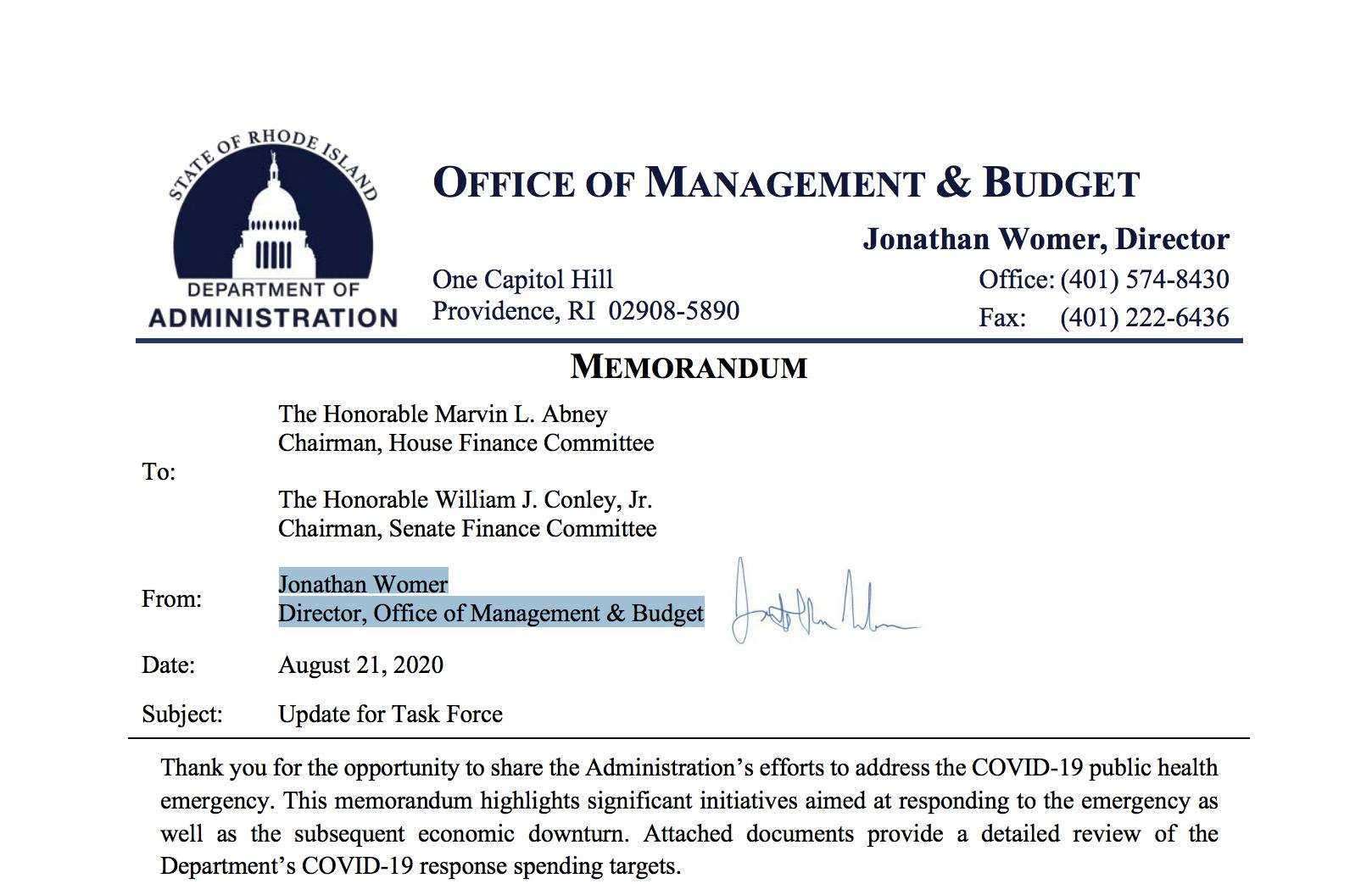 By August, Raimondo’s $150 million testing cost ballooned to $216.7 million according to a memorandum sent by Raimondo’s Jonathan Womer, Director of the Office of Management & Budget.