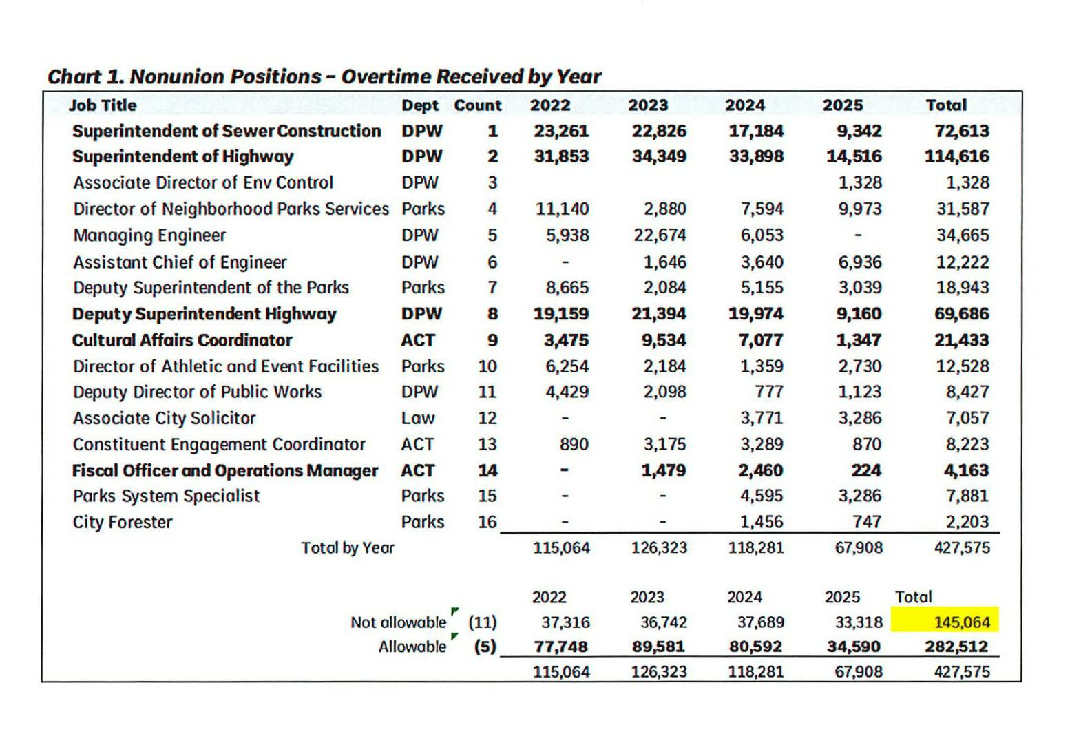 “The scope of the audit is from January 1, 2022, through February 28, 2025. For this time period, sixteen (16) nonunion employees received $427,575 for various types of overtime. Only five (5) of the sixteen (16) properly received overtime, in total amount of $282,512. Eleven (11) were in violation and collected $145,064 in overtime,” states the internal auditor’s report.