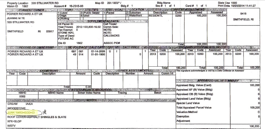 Included in the suit is the tax assessor’s field card which labels the property as a “junkyard.” Poirier responded by questioning the authenticity of the document. “I don’t think it’s authentic,” he said. In an e-mail, he suggested the document might have been “altered.” When a reporter informed him that the document was attached to a lawsuit that had been filed in Providence County Superior Court, Poirier questioned whether the suit had really been submitted to the court. He said he hadn’t seen a copy. (A link to a copy of the filing is posted below.)