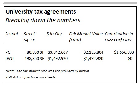 Both schools paid at least fair market value for those streets. A spokesman for Providence College said the school and the city came to an agreed upon fair market value for the three streets: $30 per square foot for Huxley Avenue and a rate of $22 for Cumberland Street and Wardlaw Avenue.