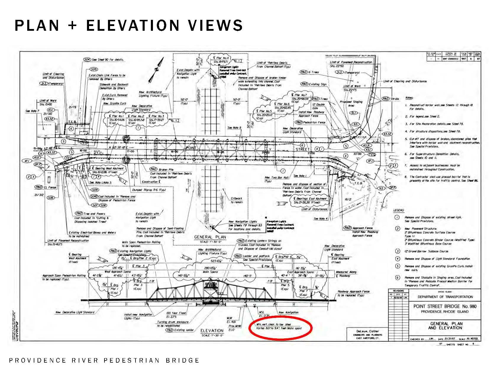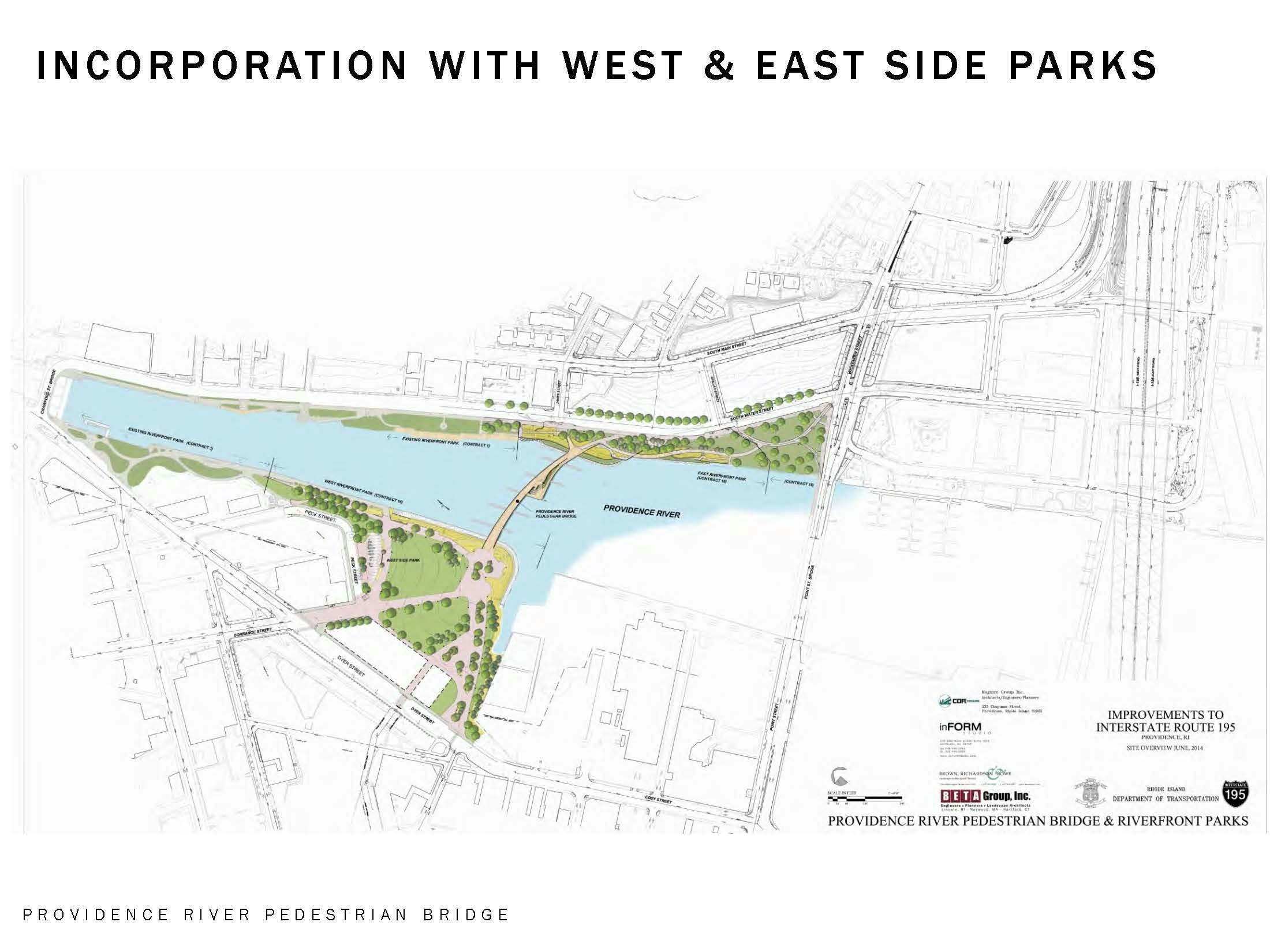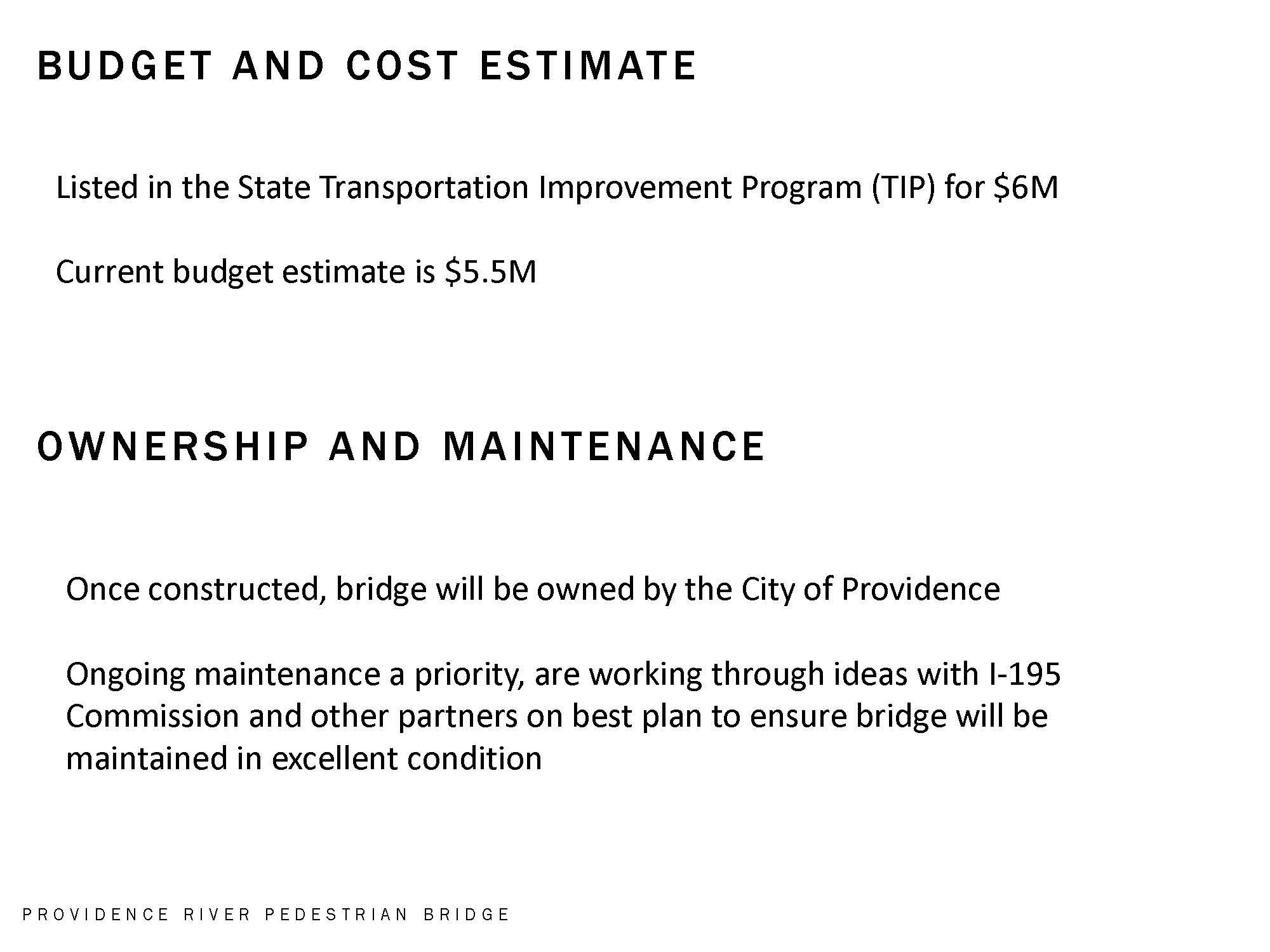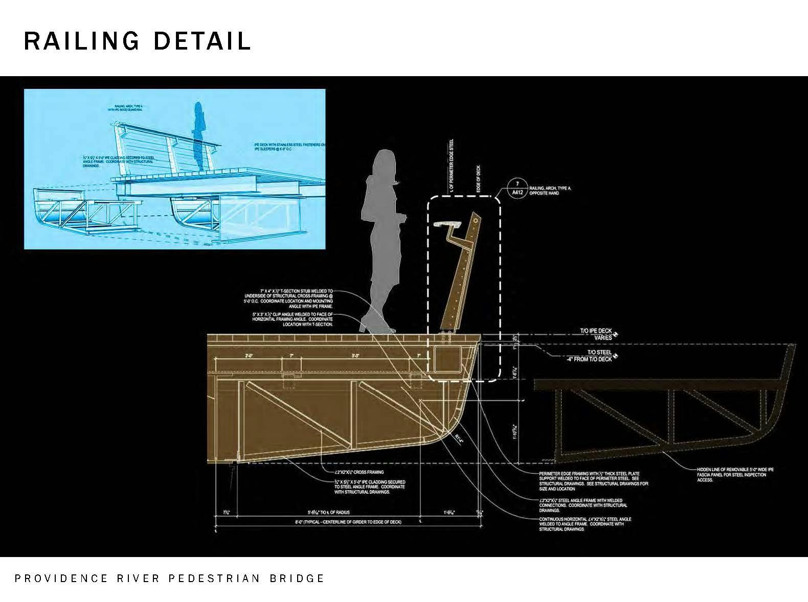 “The Providence River Pedestrian Bridge (project cost is $21.9 million) is not a typical highway bridge. It includes architectural features and uses specially fabricated items not usually associated with our bridges,” said Charles St. Martin, spokesman for the RIDOT.