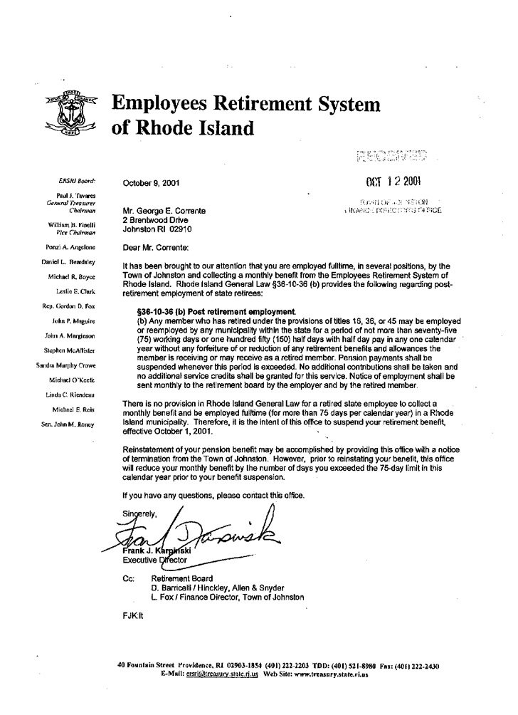 The first document is his 1998 consulting contract with the town, signed by former Mayor William Macera. The second is the letter the executive director of the Employees Retirement System of Rhode Island sent to Corrente letting him know that state law did not allow him to work full-time and collect his pension. Even though Corrente started working on a regular basis in 1998, the state retirement board did not reduce his pension benefits until the fall of 2001.