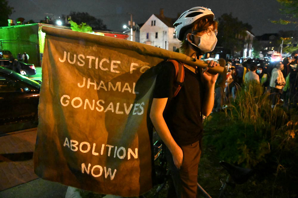 The protest was sparked by the Sunday crash involving moped rider Jhamal Gonsalves and a Providence police vehicle.