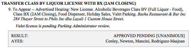 The Providence Board of Licenses voted Wednesday to transfer Kartabar's liquor license -- with a 2 a.m. closing -- to their new restaurant and bar, "Layali," at 1 Custom House Street, pending a valet license under review with the parking administrator.