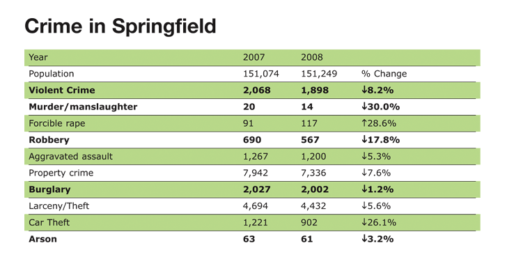 To view the 2007 crime data, click here and scroll down to Springfield. To view the 2008 data click here.