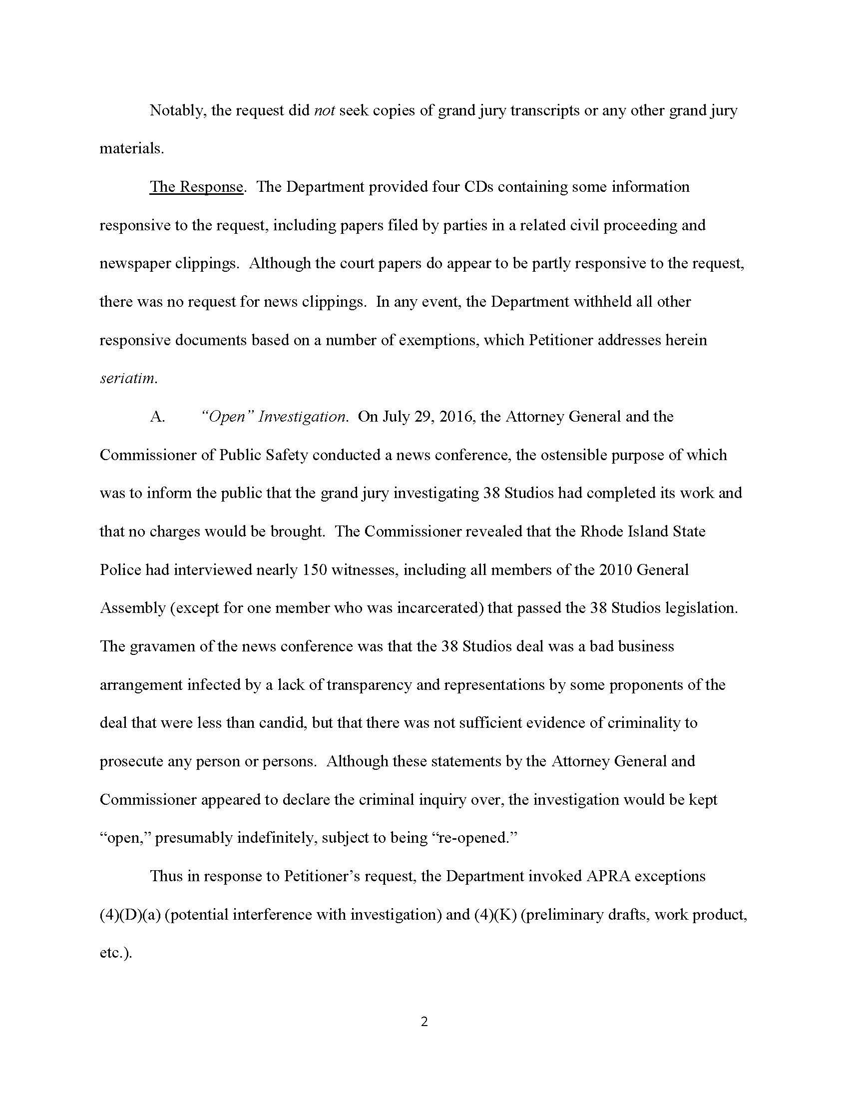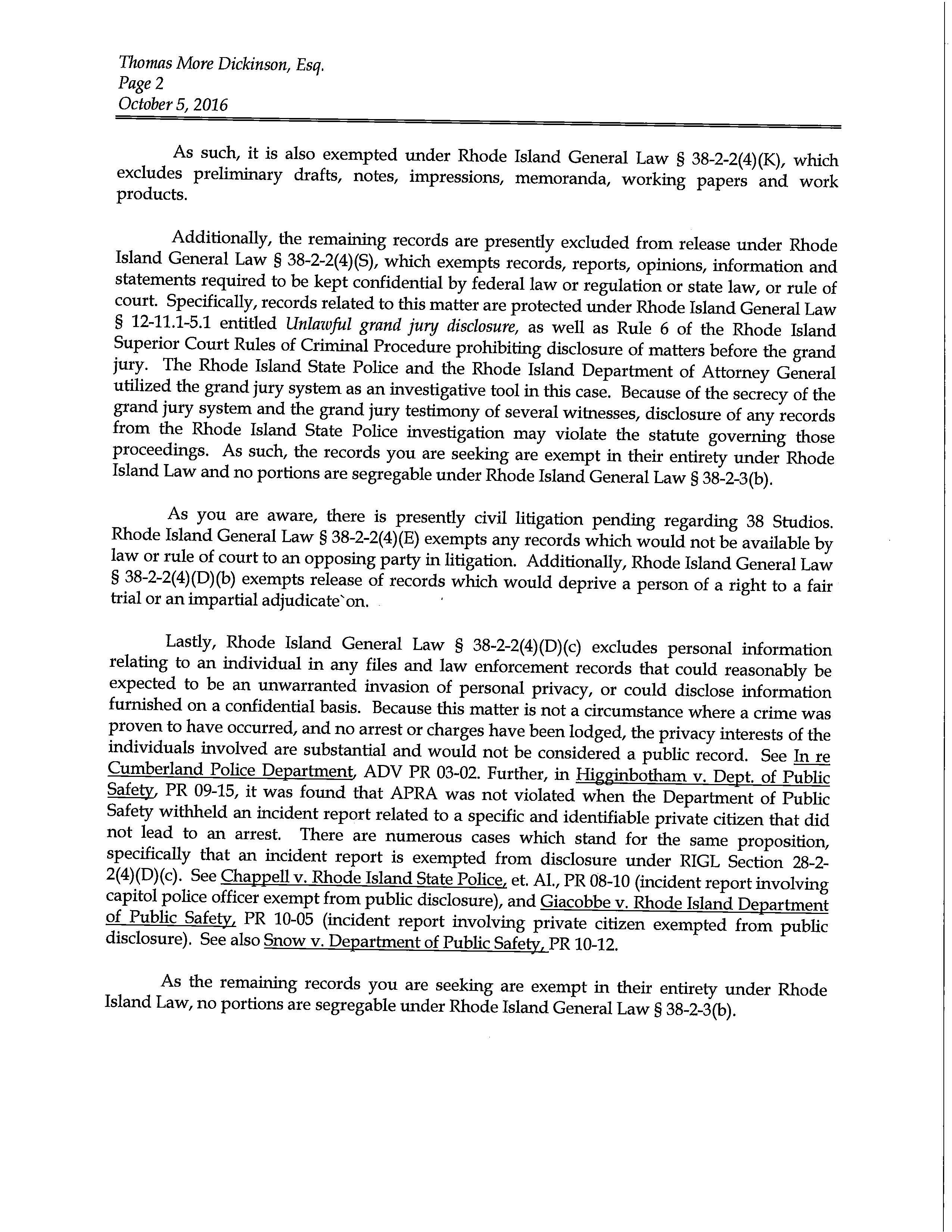 The legislation (2017-S 0932A, 2017-H 5347B requires that any investigatory records generated or obtained by the Rhode Island State Police or the Rhode Island Attorney General in conducting an investigation surrounding the funding of 38 Studios, LLC by the Rhode Island Economic Development Corporation shall be made available to the public.