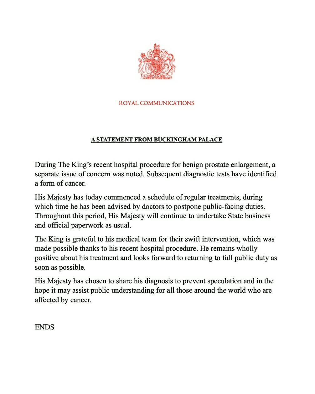 Buckingham Palace says the King "remains wholly positive about his treatment and looks forward to returning to full public duty as soon as possible."