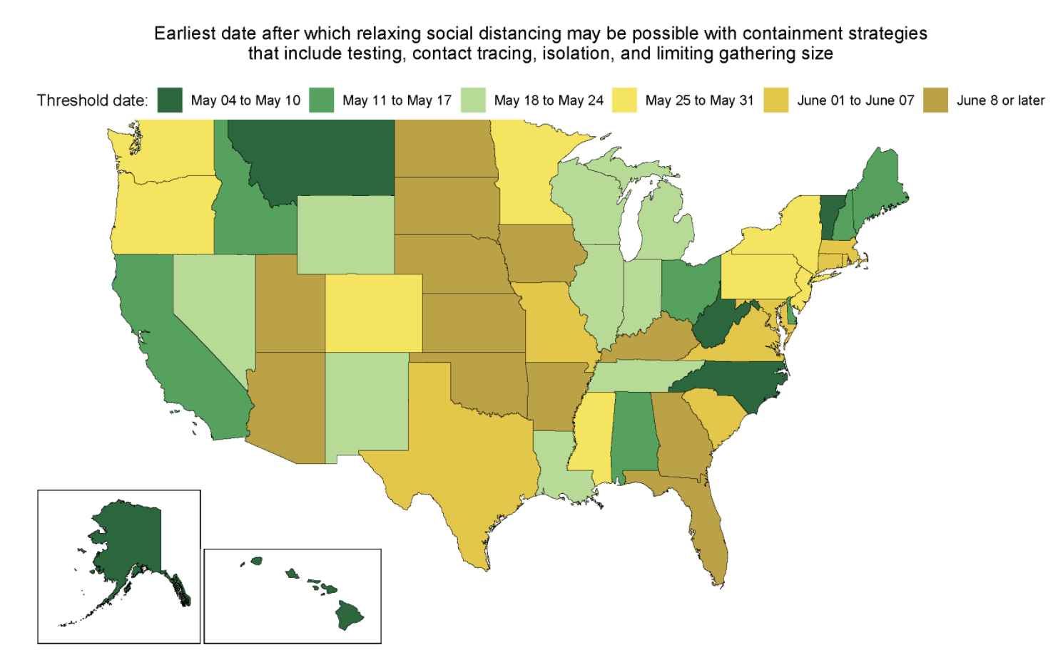IHME released a map of the United States breaking down by state the “earliest day after which relaxing social distancing may be possible with containment strategies that include testing, contact tracing, isolation, and limiting gathering size.”