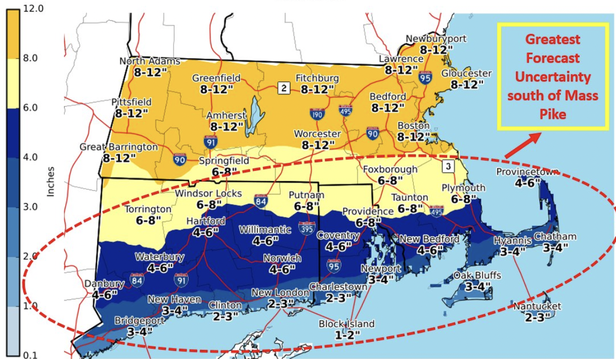 The National Weather Service is now predicting 4-8 inches of snow for Rhode Island and southern New England on Friday.