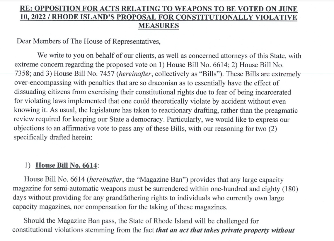 This week, the Rhode Island Senate approved the House bill to ban extended magazines, and lawyers Michael Kelly, Dane Ardente, and Thomas Romana have put members of the House of Representatives on notice that on behalf of clients, they will challenge the ban.