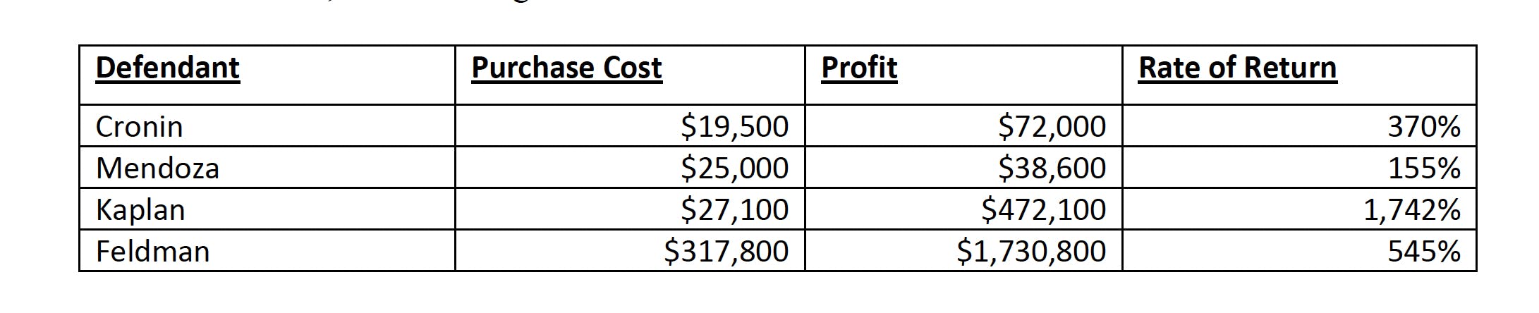 “Portola’s stock price increased by over 130% on the day of the Announcement. Cronin, Kaplan, Feldman, and Mendoza collectively profited by more than $2.3 million from their unlawful insider trading. Kaplan’s and Feldman’s successive tippees profited by approximately $1.7 million.