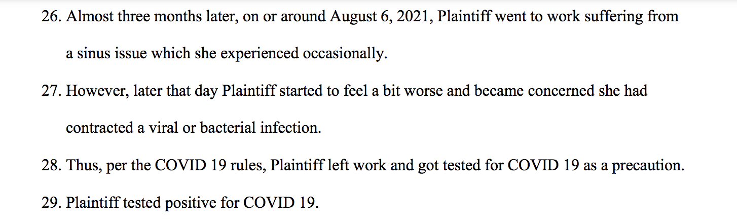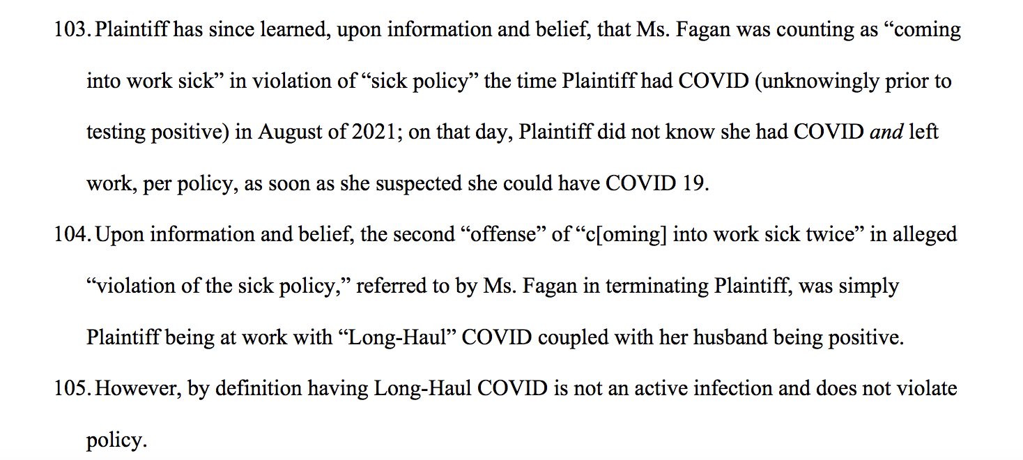 Desilets said she then applied for FMLA and was approved for it by September 2021, at which time she was suffering from “long haul” COVID symptoms.