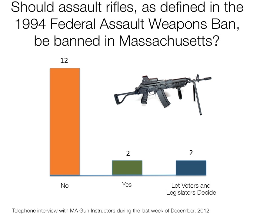 Of the instructors polled, 87.5% reported they would like to see armed guards, teachers or both in schools. In addition, 75% of the respondents said they were against the outlawing of assault rifles, as defined by the 1994 Federal Assault Weapons Ban, in Massachusetts.