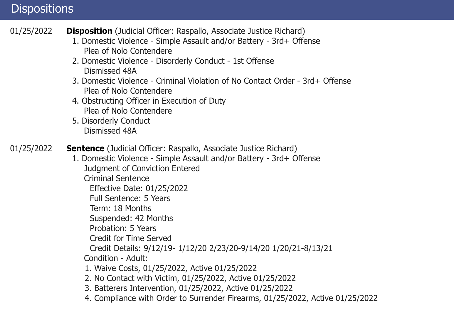 When Doggett was arrested on previous felony domestic violence charges on February 22, 2020, records show he had been given a “full” five year sentence on January 25, 2022 by Judge Richard Raspallo, with a term of 18 months and 42 months suspended.