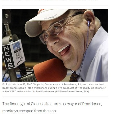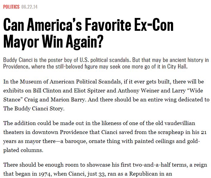 "In the Museum of American Political Scandals, if it ever gets built, there will be exhibits on Bill Clinton and Eliot Spitzer and Anthony Weiner and Larry “Wide Stance” Craig and Marion Barry," David Freelander at the Daily Beast wrote this week. "And there should be an entire wing dedicated to The Buddy Cianci Story,"