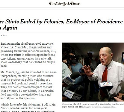 The New York Times identified Cianci as "the garrulous and polarizing former mayor of Providence, R.I., whose two stints in office collapsed in felony convictions."