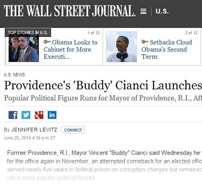"In Providence, Mr. Cianci, an Independent, is widely viewed as having an almost supernatural gift for retail politics, wrote Jennifer Levitz of the Wall Street Journal. "The long-standing joke was that at least one cliché was written for him: Buddy Cianci would attend the opening of an envelope."