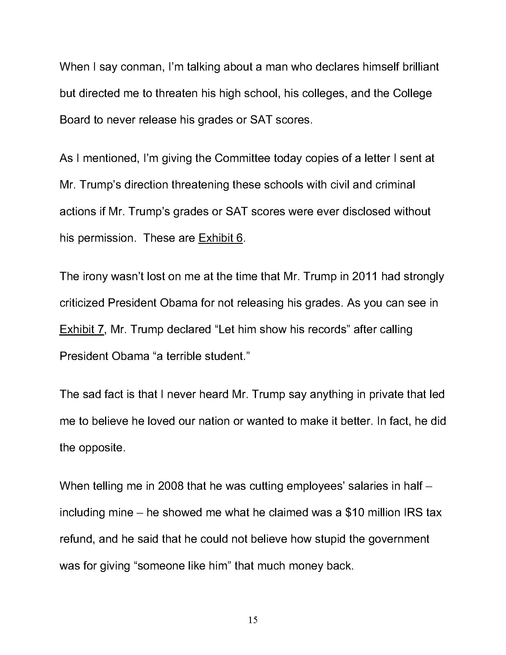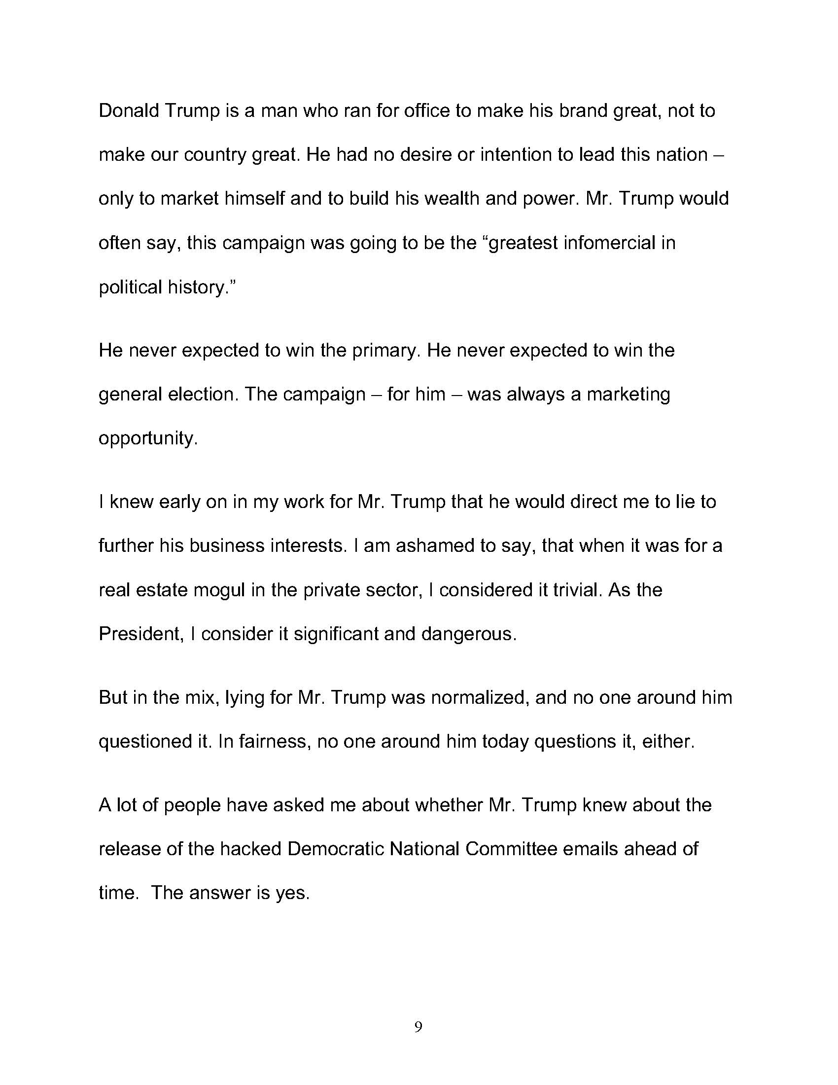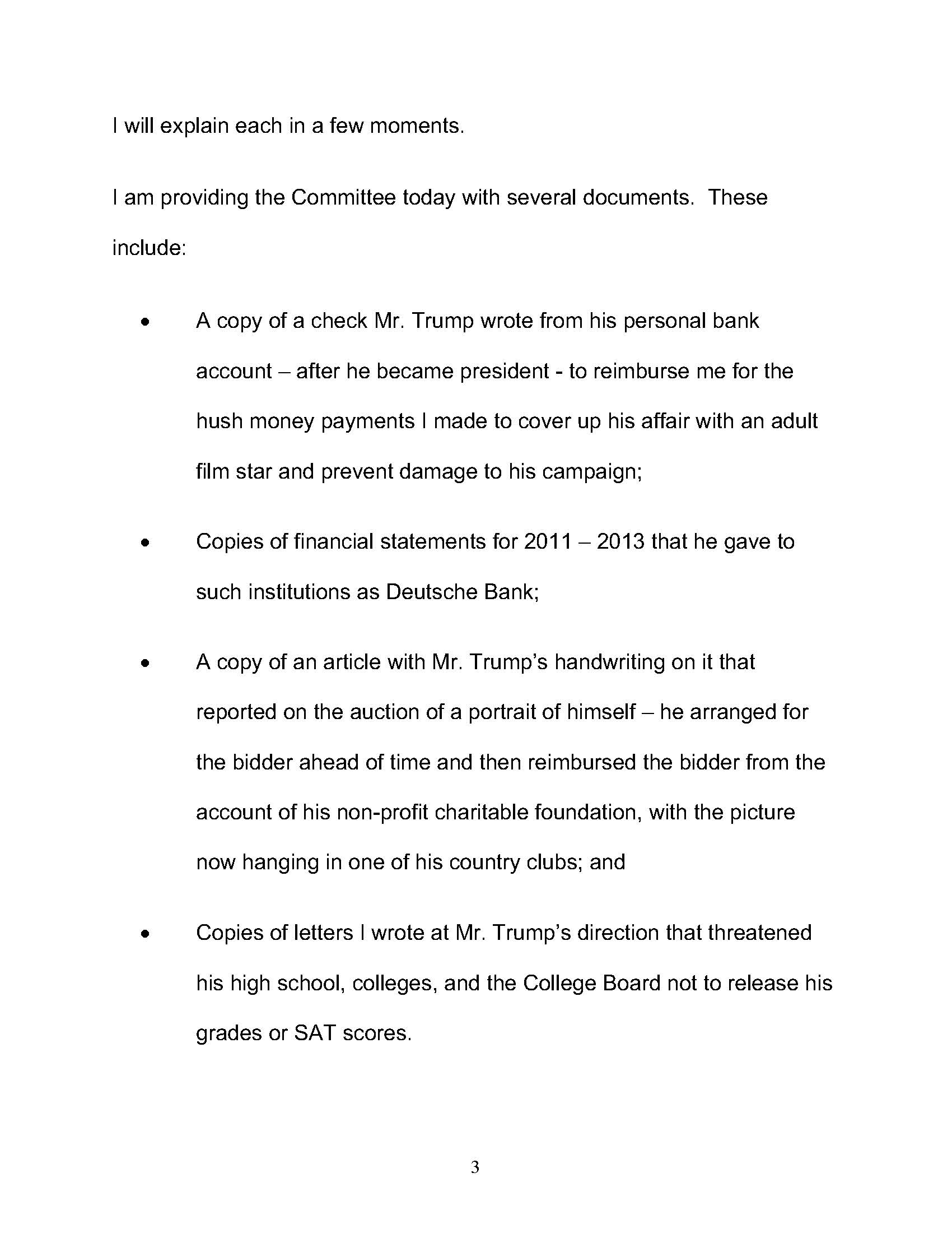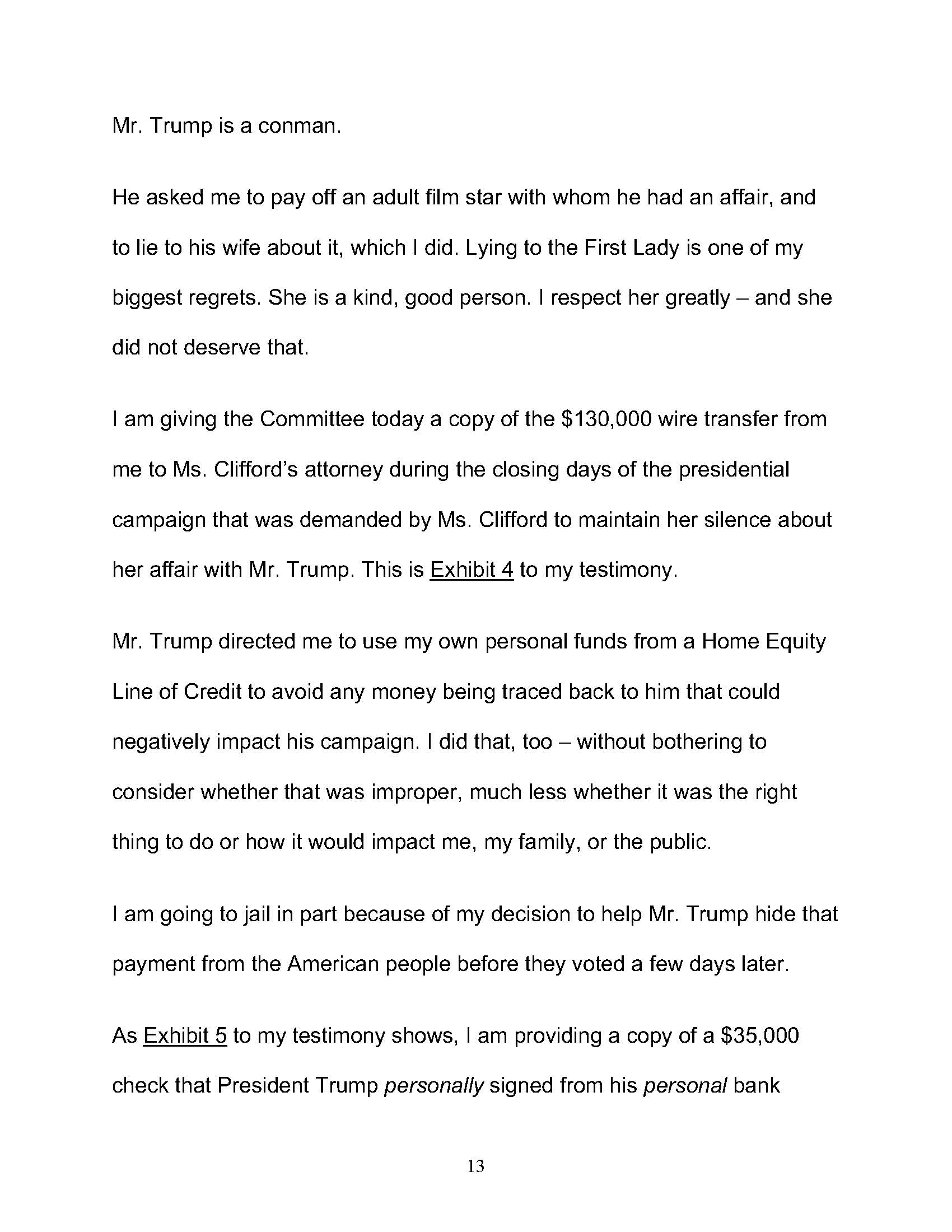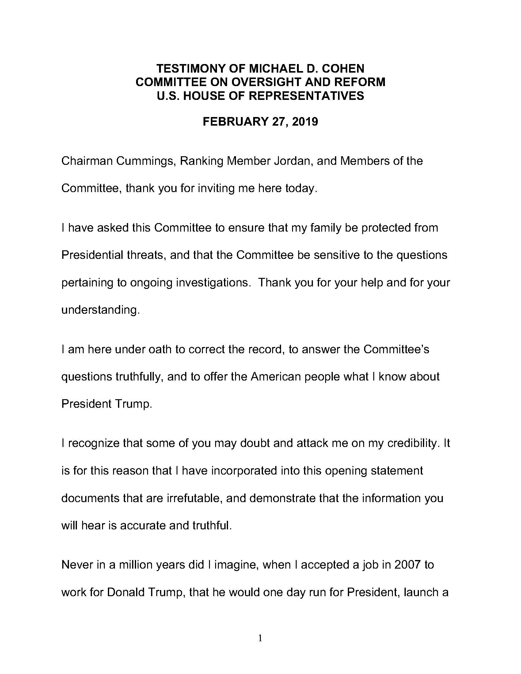 “I recognize that some of you may doubt and attack me on my credibility. It is for this reason that I have incorporated into this opening statement documents that are irrefutable, and demonstrate that the information you will hear is accurate and truthful,” says Cohen in the testimony.