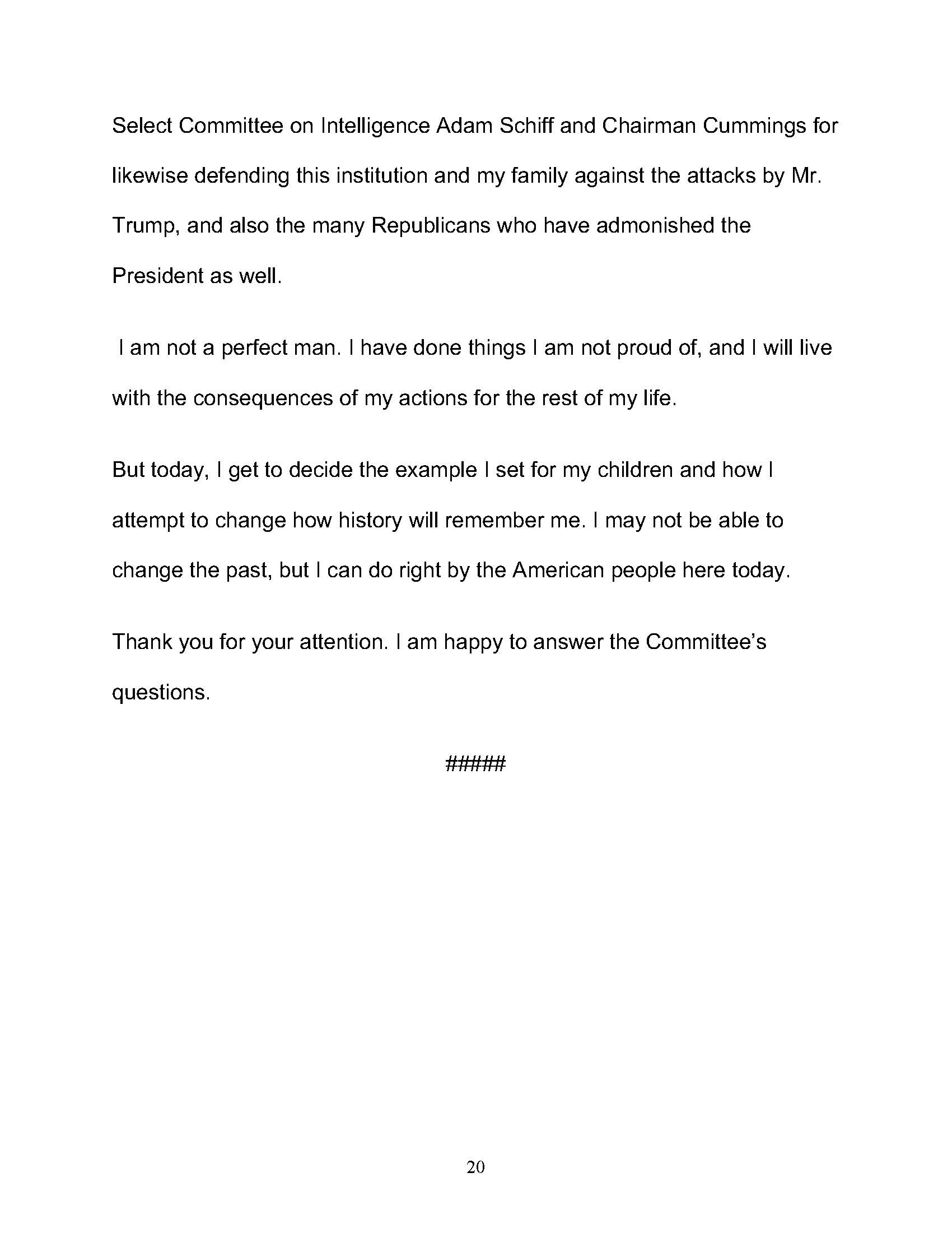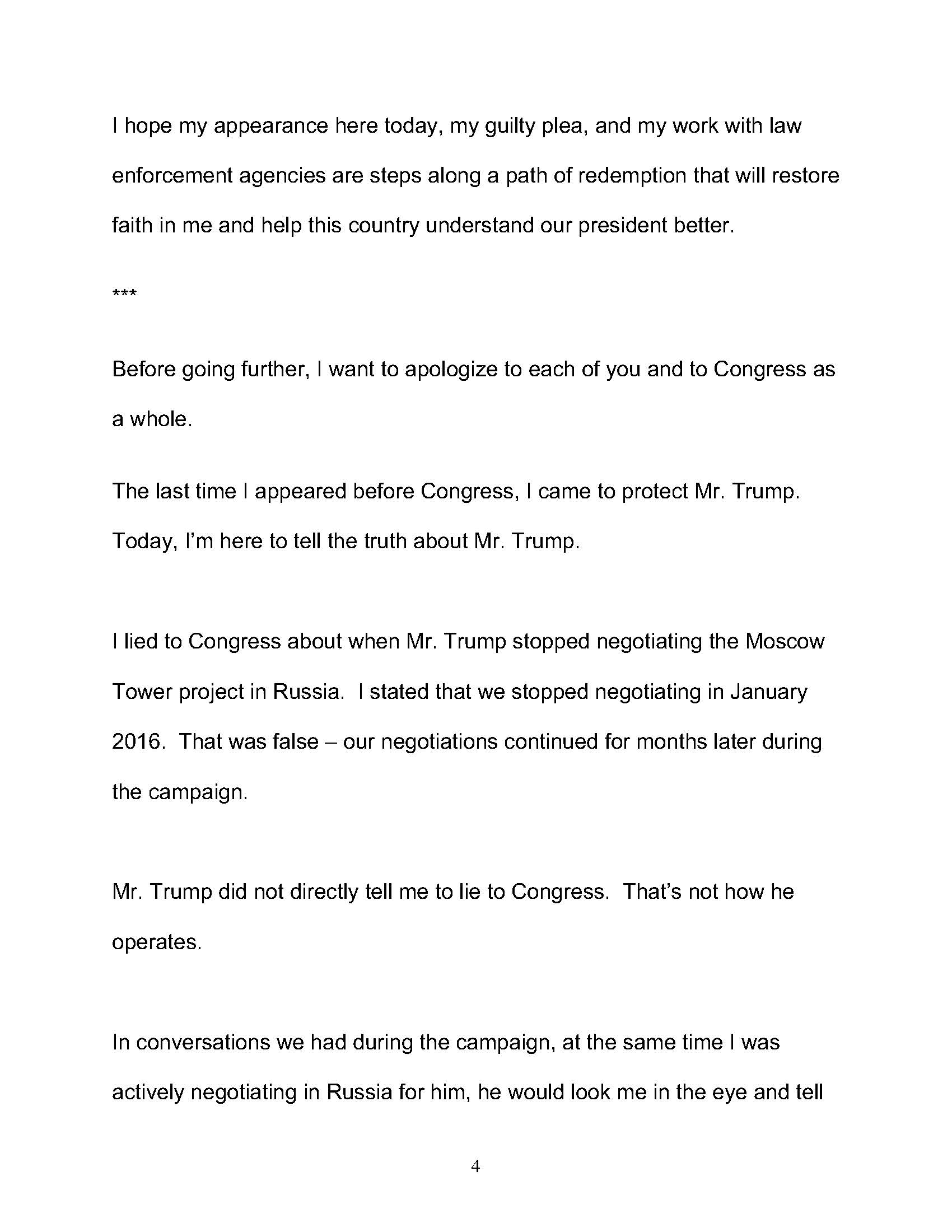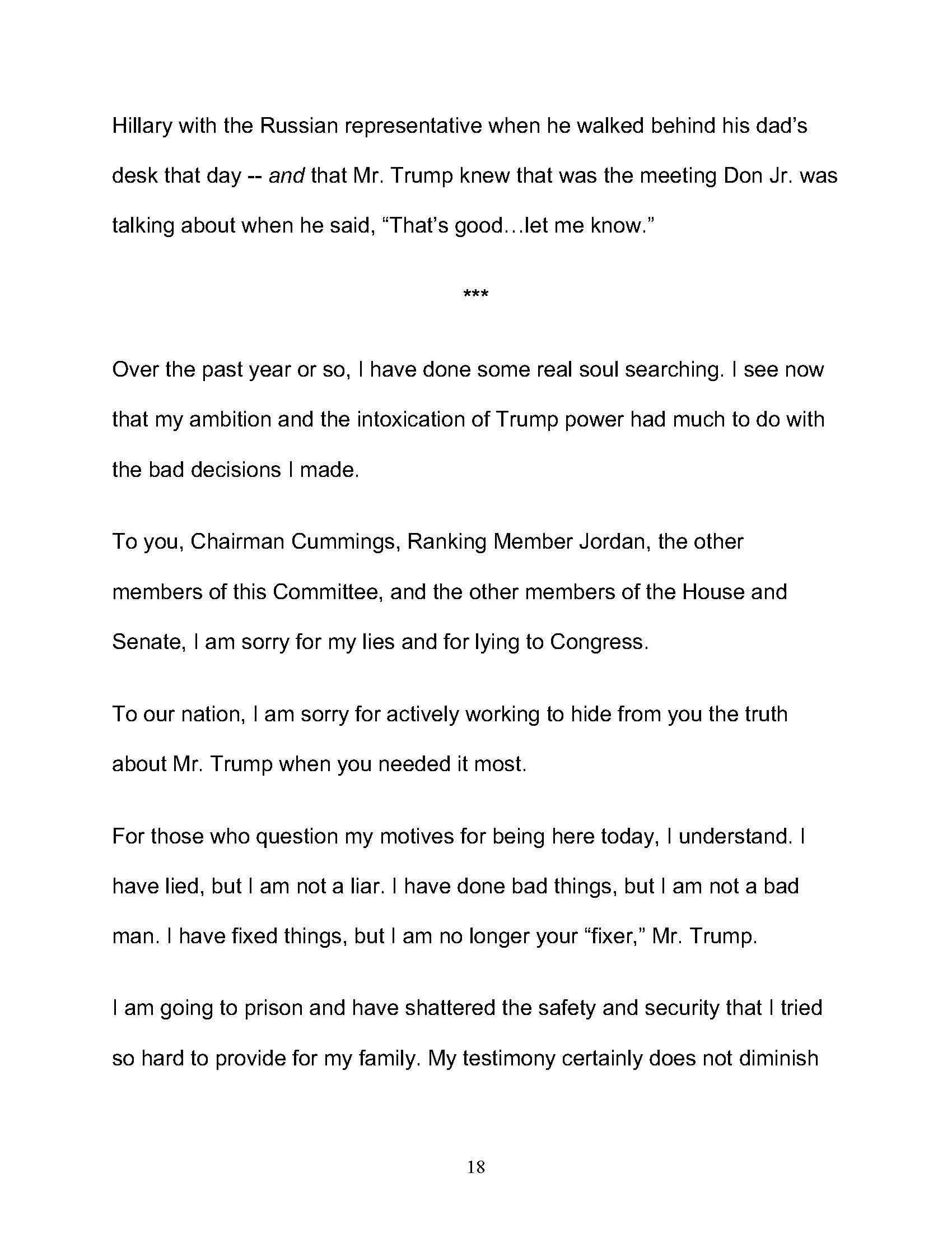 Cohen said in his prepared testimony, "I wound up touting the Trump narrative for over a decade. That was my job. Always stay on message. Always defend. It monopolized my life. At first, I worked mostly on real estate developments and other business transactions. Shortly thereafter, Mr. Trump brought me into his personal life and private dealings.