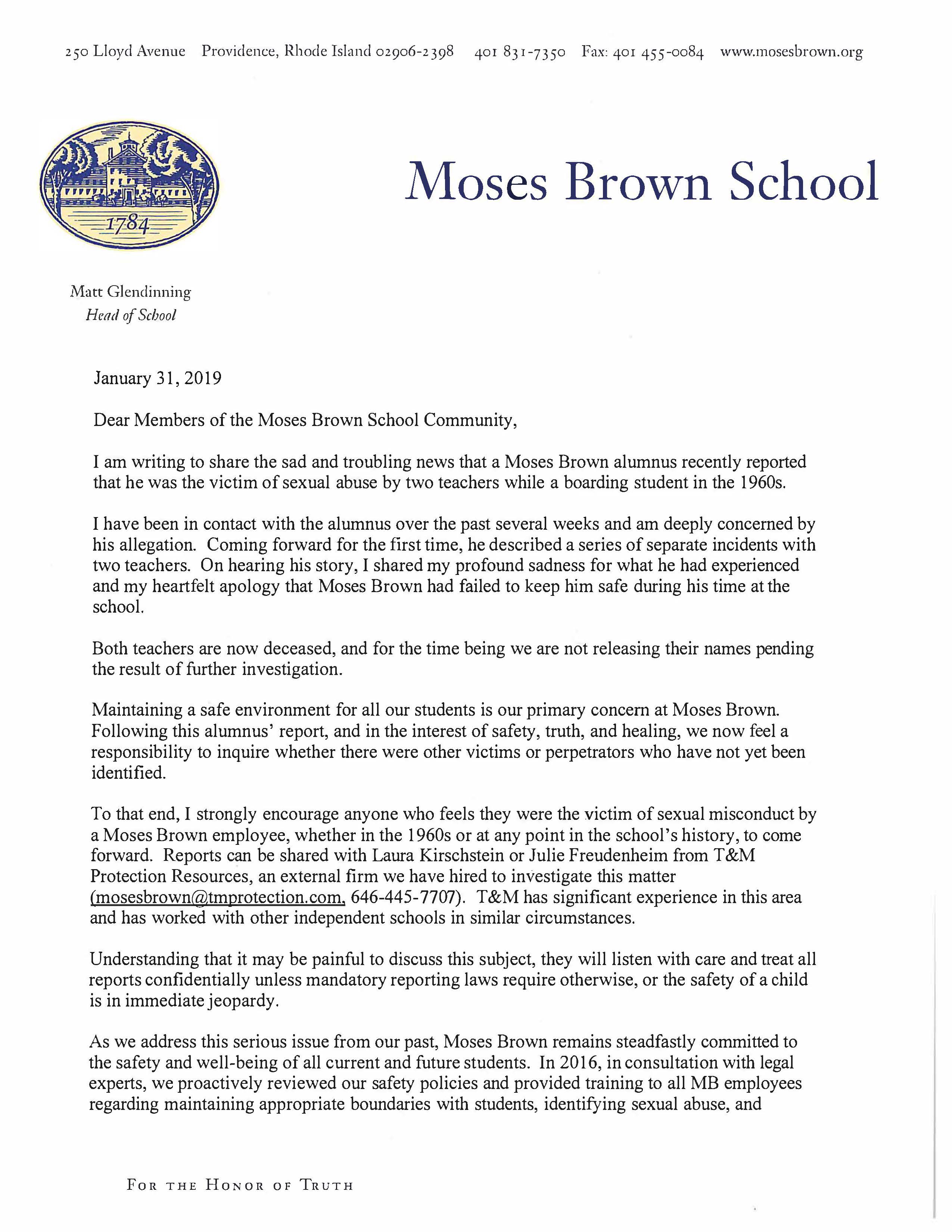 Maintaining a safe environment for all our students is our primary concern at Moses Brown. Following this alumnus' report, and in the interest of safety, truth, and healing, we now feel a responsibility to inquire whether there were other victims or perpetrators who have not yet been identified."