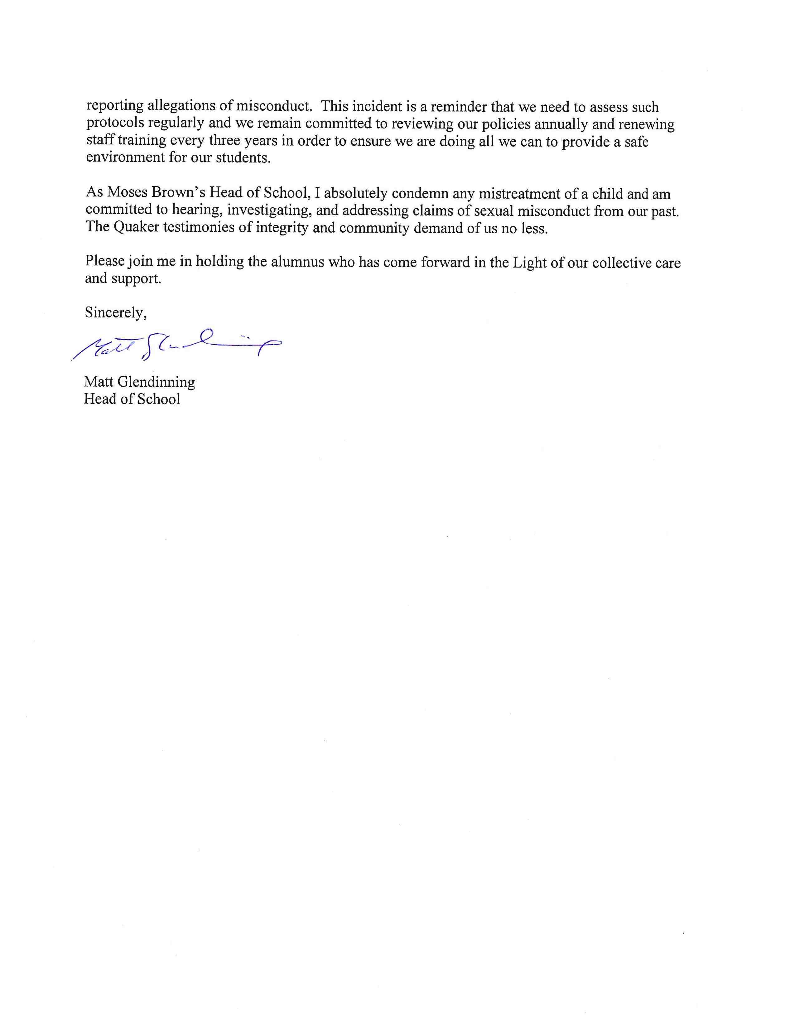 "I have been in contact with the alumnus over the past several weeks and am deeply concerned by his allegation. Coming forward for the first time, he described a series of separate incidents with two teachers. On hearing his story, I shared my profound sadness for what he had experienced and my heartfelt apology that Moses Brown had failed to keep him safe during his time at the school.
