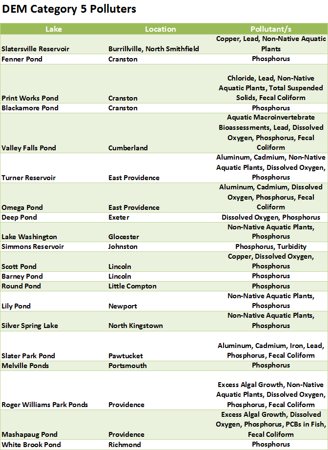 The report found that three cities and towns (Cranston, Lincoln and Providence) had at least two bodies of water making the Category 5 list.