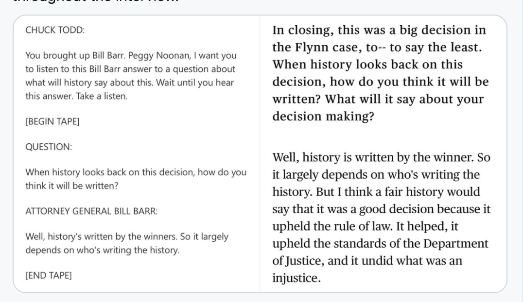 "You’re correct. Earlier today, we inadvertently and inaccurately cut short a video clip of an interview with AG Barr before offering commentary and analysis. The remaining clip included important remarks from the attorney general that we missed, and we regret the error.”
