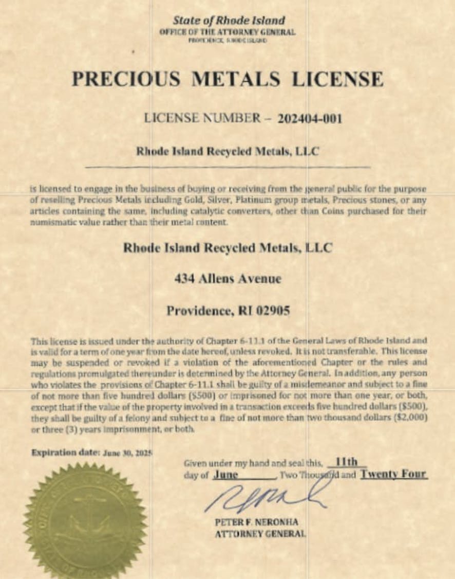 Brian Hodge, a spokesperson for Neronha, said in an email to GoLocal, “This Office licenses businesses that deal in precious metals and other regulated metals - not scrap metal. A business can deal in scrap metal without precious metals and regulated metals licenses from this Office."