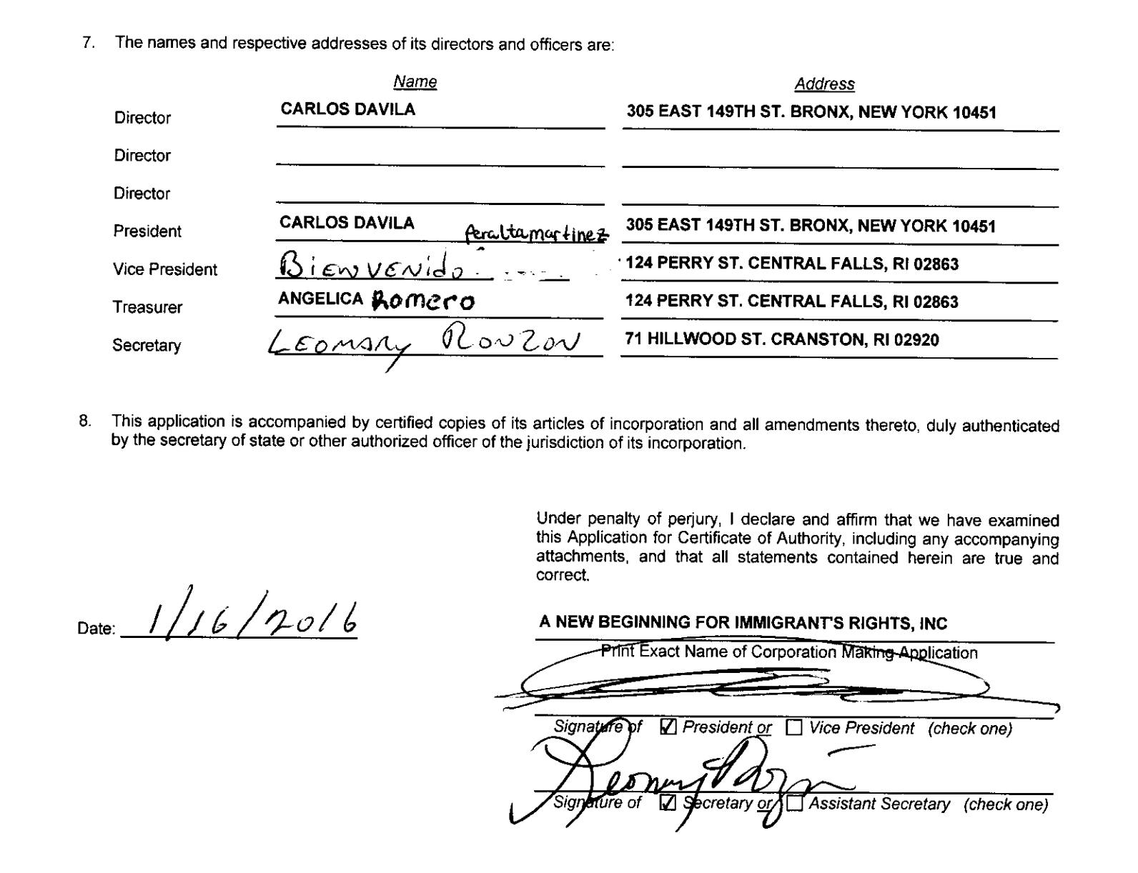 NY hit scheme with $1.3M fineDavila and Central Falls' Bienvenido "Alex" Peralta Martinez are listed by the State of Rhode Island as being the President and Vice-President of "A New Beginning for Immigrants' Rights," which a Venezuelan national told GoLocal he paid over $1,000 to help obtain a work permit, only to receive what he said was fraudulent paperwork.