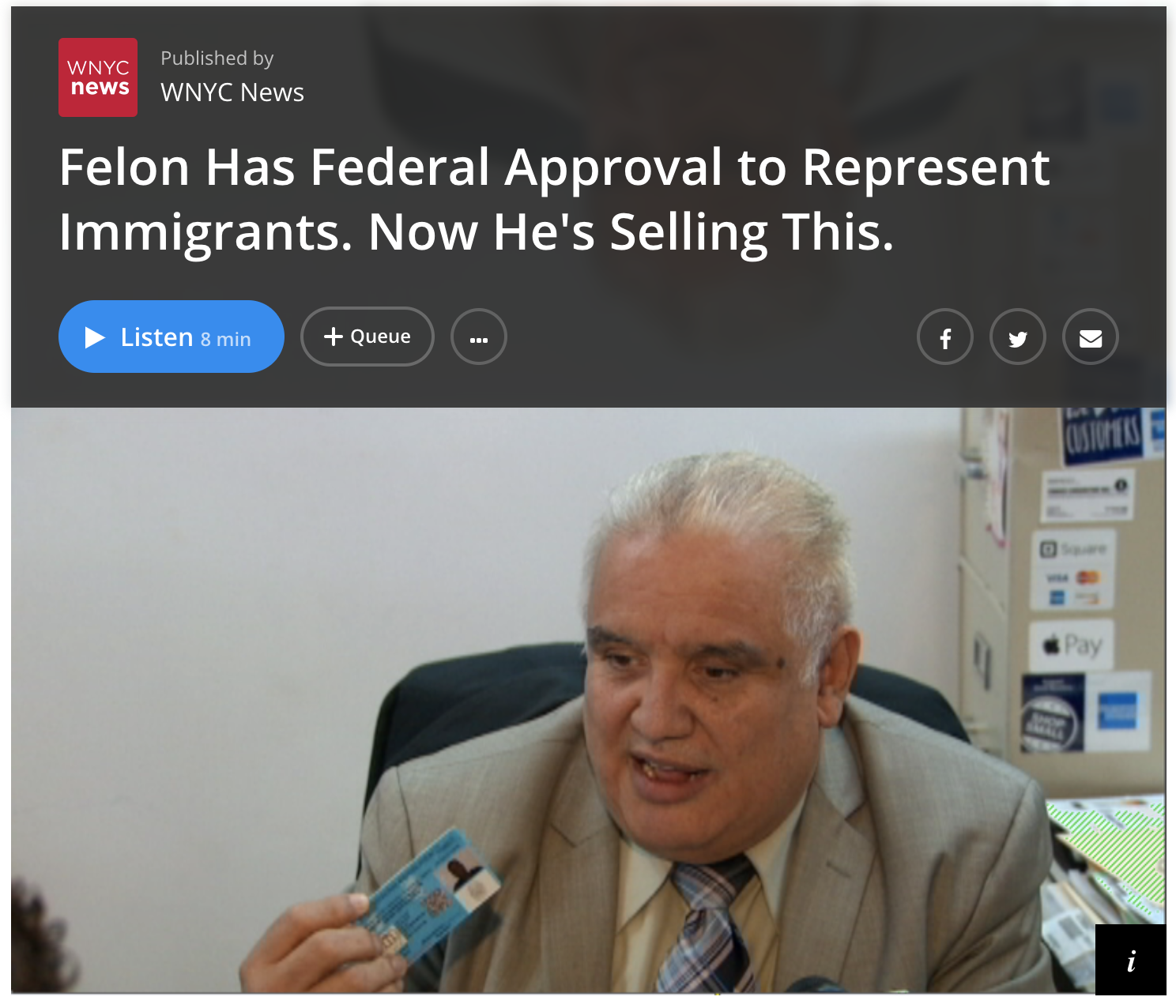 "A Bronx businessman authorized by the federal government to represent immigrants in legal proceedings is selling $200 cards on a false promise that they offer protection against deportation, an investigation by WNYC and Telemundo 47 has found.