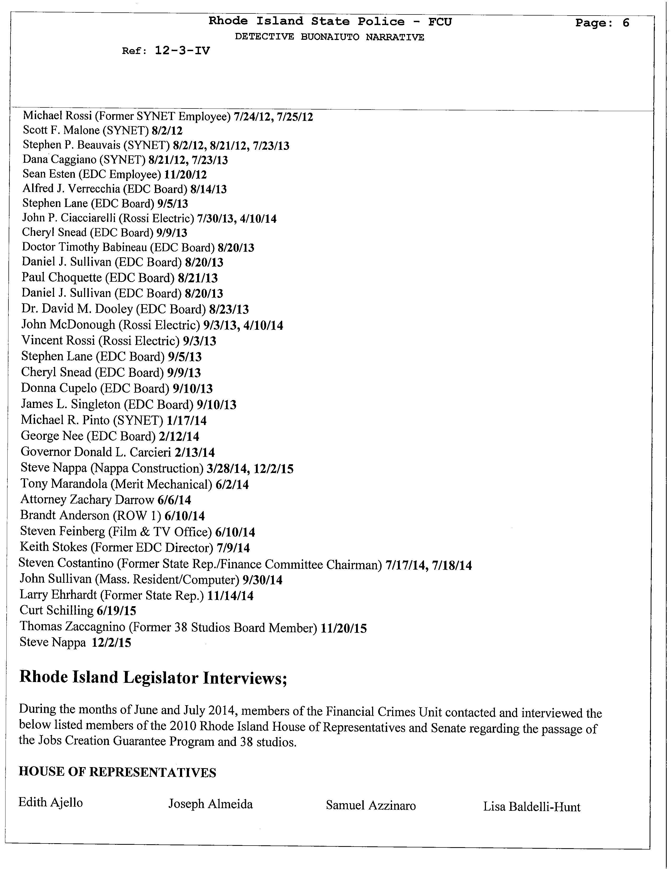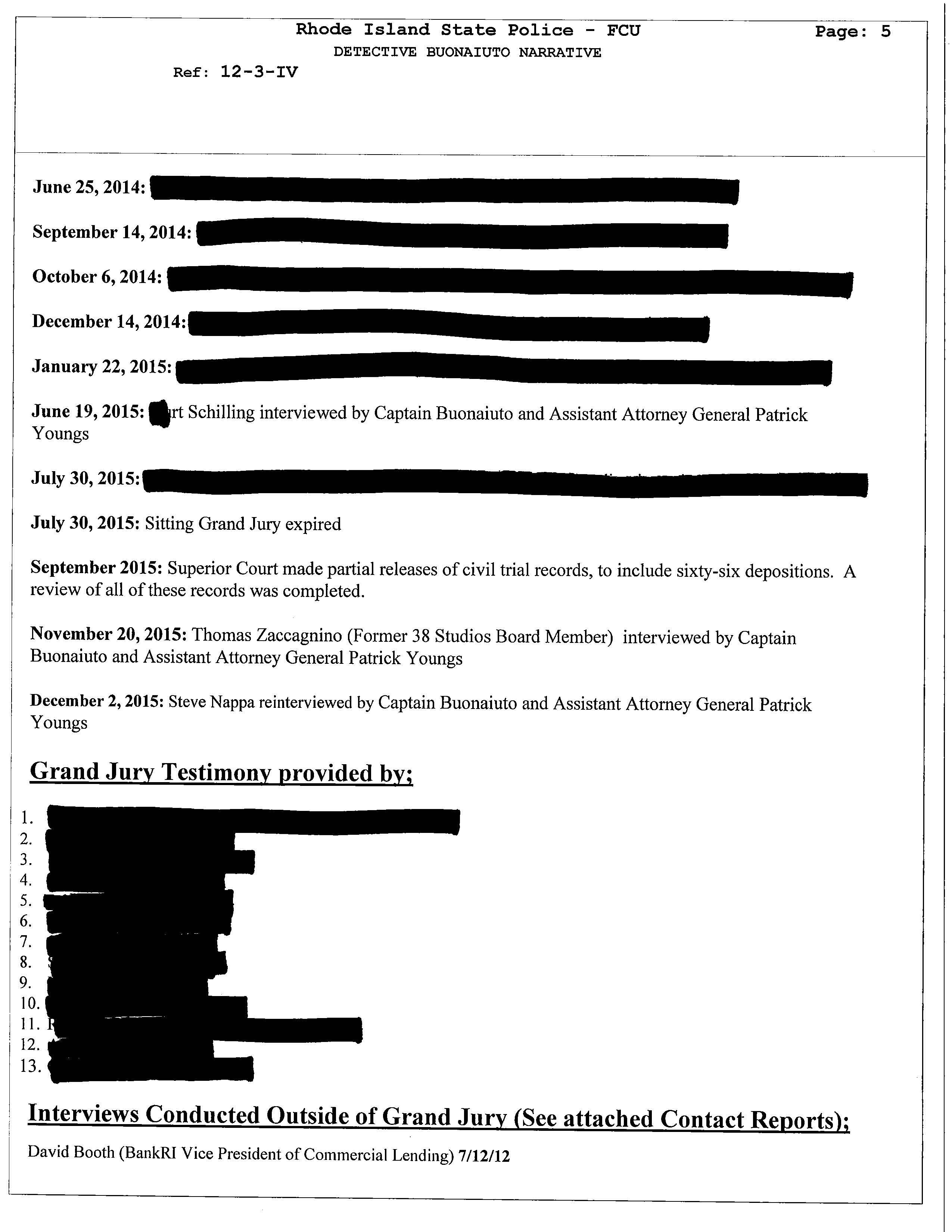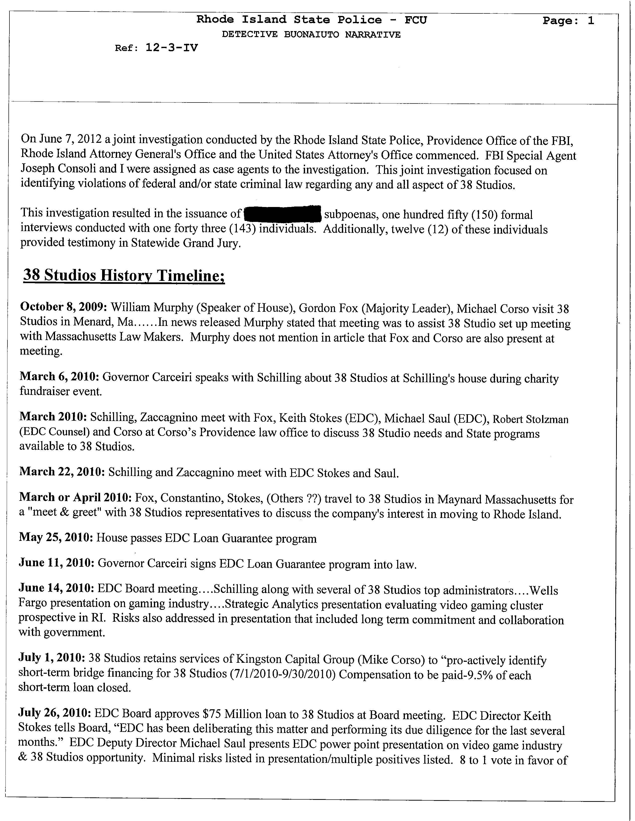 The documents unveil that many of the legislators who were interviewed claimed that the had no knowledge of the guarantee loan program legislation was intended to benefit 38 Studios. Two powerful legislators Senate President Teresa Paiva Weed and House Finance Chair Steven Costantino admitted they knew the legislation was intended to benefit 38 Studios. The claimed they did not tell members to keep other states from competing to land Curt Schilling's gaming company.