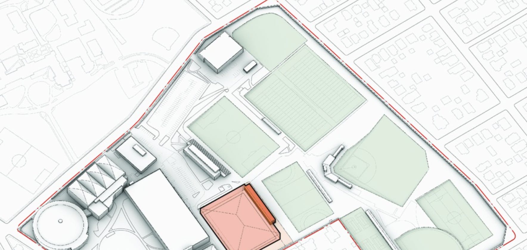The site is located within Brown's athletic complex, directly behind the Olney-Margolies Athletic Center. The project would replace the outdoor practice field with an indoor facility featuring a 52,000-square-foot turf playing surface, an entry lobby, restrooms, and space for equipment storage.