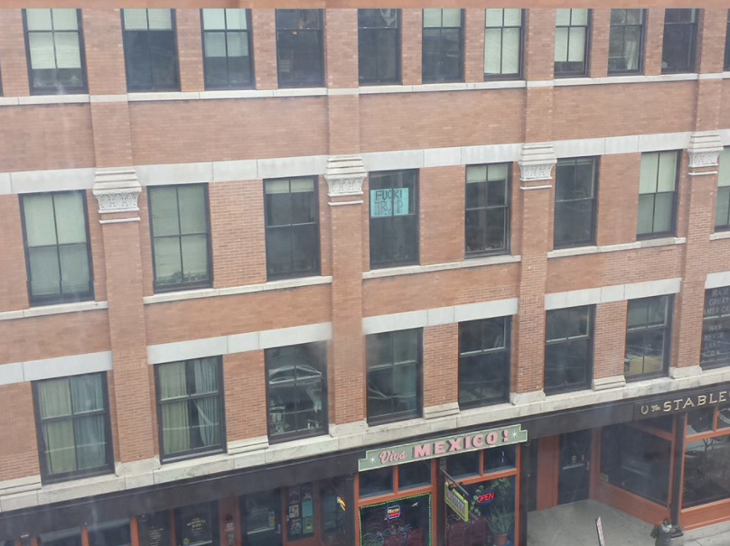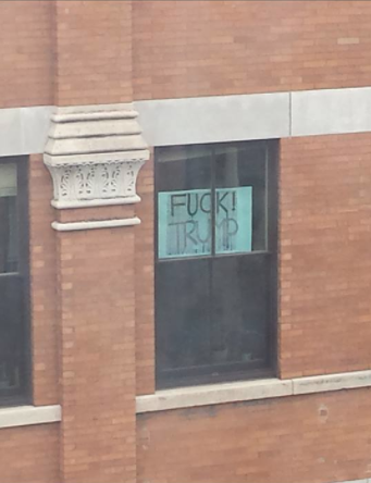 So FB friends, across the street from my school is the AS220 studio/apartments. Apparently one of their residents has decided to express their views regarding Trump.