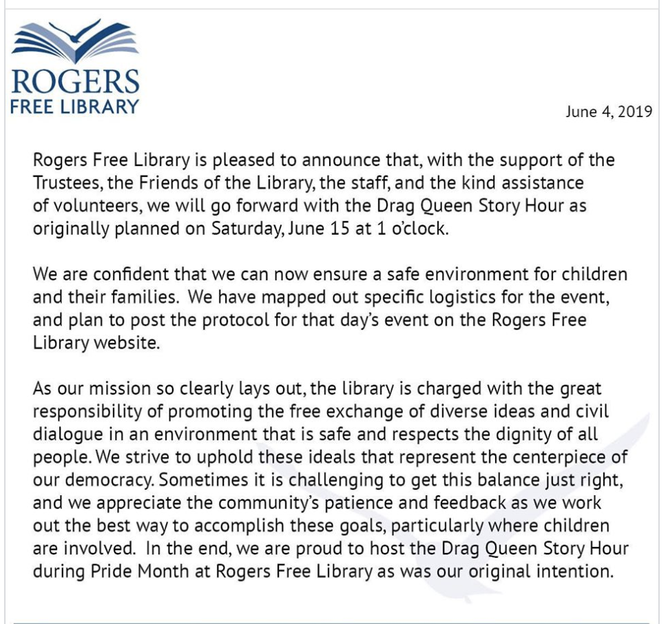 READ: Rogers Free Library's Post on Drag Queen Story Hour Reinstatement BELOW