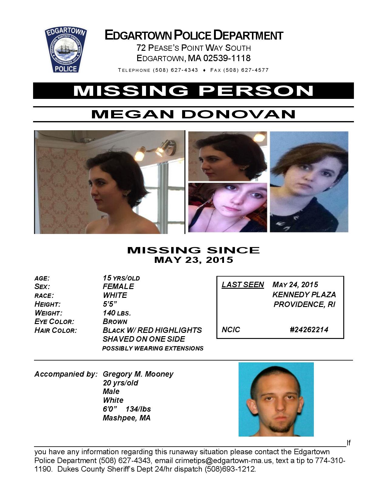 GET THE LATEST BREAKING NEWS HERE -- SIGN UP FOR GOLOCAL FREE DAILY EBLASTThe police believes Megan could be with Gregory Mooney, a 20-year old male of Mashpee, Mass. He is described as 6-feet-tall and weighing 135 pounds.