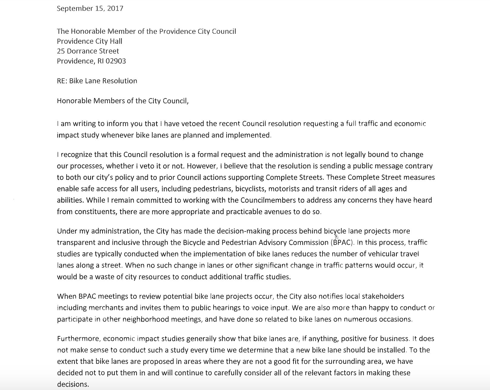 GET THE LATEST BREAKING NEWS HERE -- SIGN UP FOR GOLOCAL FREE DAILY EBLAST"I vetoed the Providence City Council’s resolution regarding bike lane planning because it sends the wrong message about bicycle and pedestrian safety here in Providence. We support Complete Streets here in our city, meaning that our infrastructure is designed and operated for safe access for all users, of all abilities. We will continue to engage the community in these decisions and we remain committed to working with the Council members to address any concerns they have heard from constituents."
