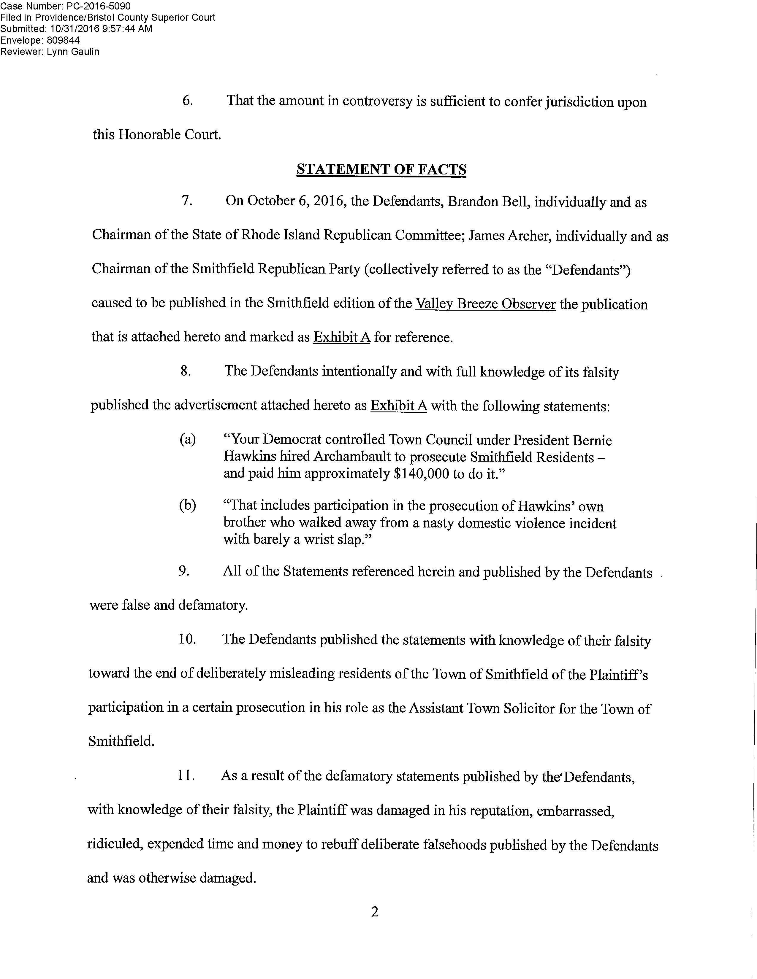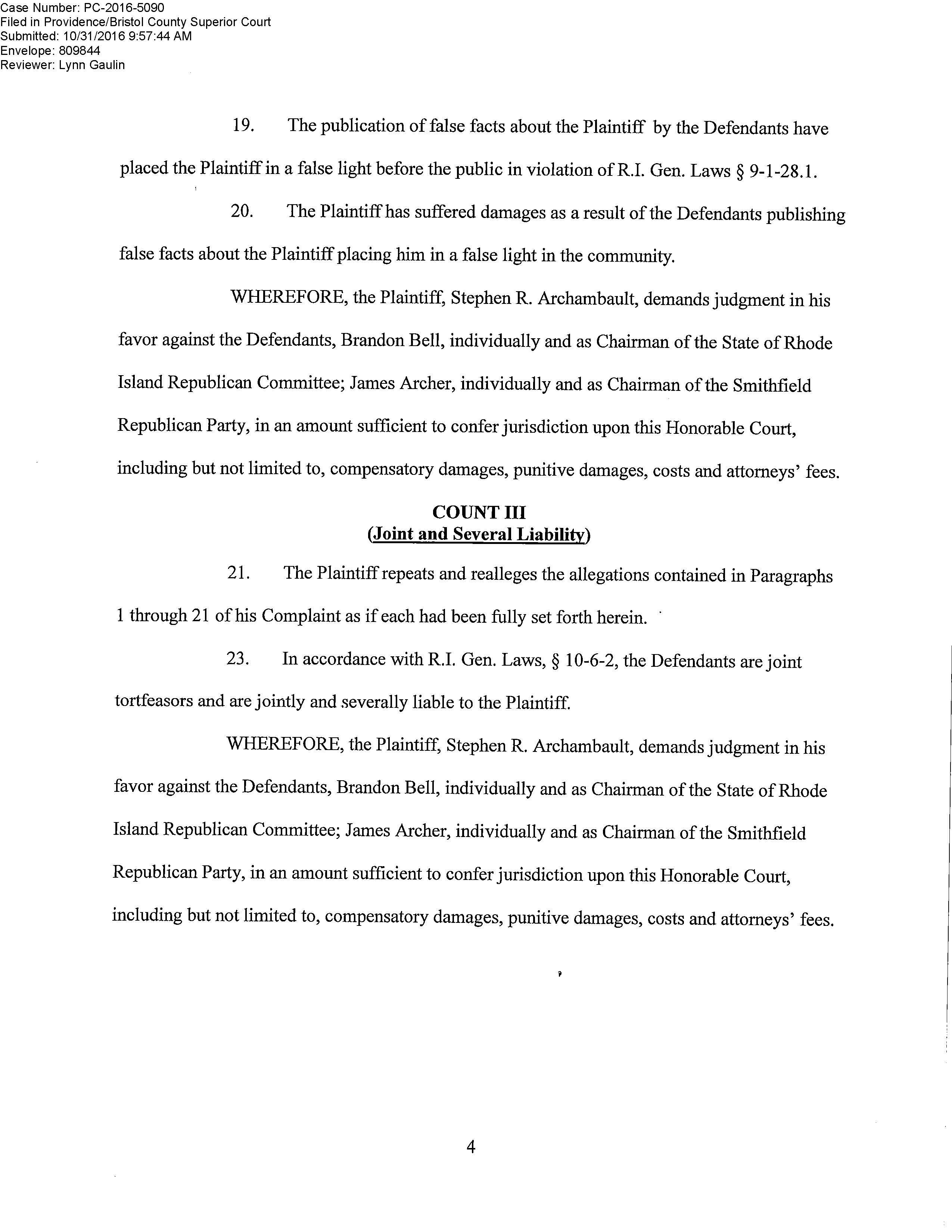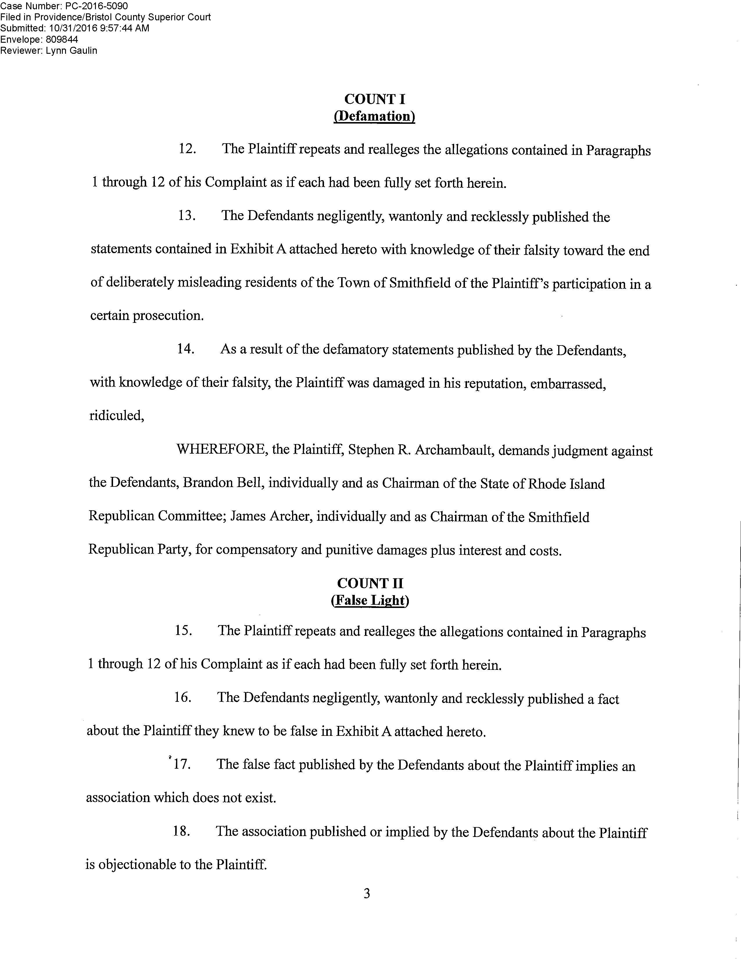 The lawsuit, filed by Archambault's attorney Tim Robenhymer on Monday, charged Bell and Smithfield GOP Chair James Archer, individually and in their roles as party chairs, with "defamation, false light, and joint and several liability" for alleging Archambault had a role in letting the Town Council President's brother off on a domestic violence charge, while serving as an assistant town solicitor.
