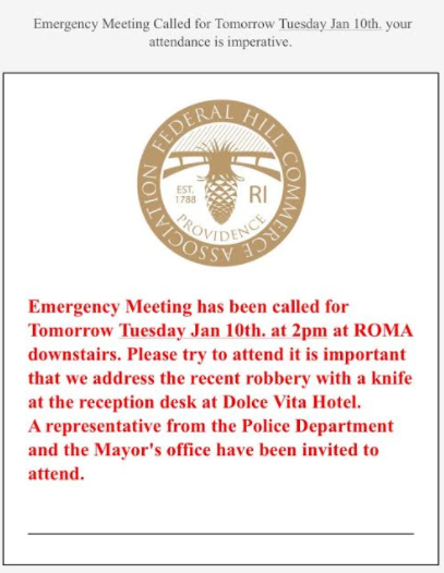 Hotel Dolce VitaA recent assault and robbery at Hotel Dolce Vita on Federal Hill has prompted an emergency meeting among local business owners Tuesday afternoon in Providence.
