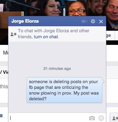 I made a post on the Mayor Elorza's [Facebook] page about the poor snow plowing job, it was nothing bad and a woman asked me on the post how we can do something about this because nobody is responding on his page to the complaints. I responded I am working on something and to join my group, two min later the post was deleted!